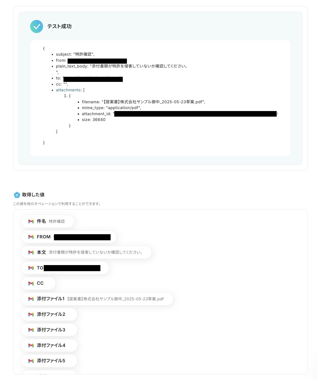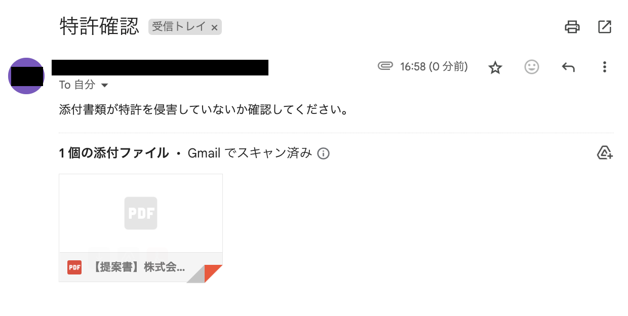 設定が完了したら、動作チェックのためにテストを行います。 特許確認用のテスト書類を添付した状態で、「キーワード」に設定した値を含むメールを送信してください。