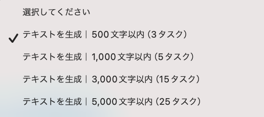 こちらも同様にタイトルは必要に応じて変更し、アクションを活用シーンに合わせて選択します。 デフォルトでは「テキストを生成|500文字以内(3タスク)」が設定されていますが、下図から自由に選択できますよ!(500文字以内のプロンプトを設定できます。)