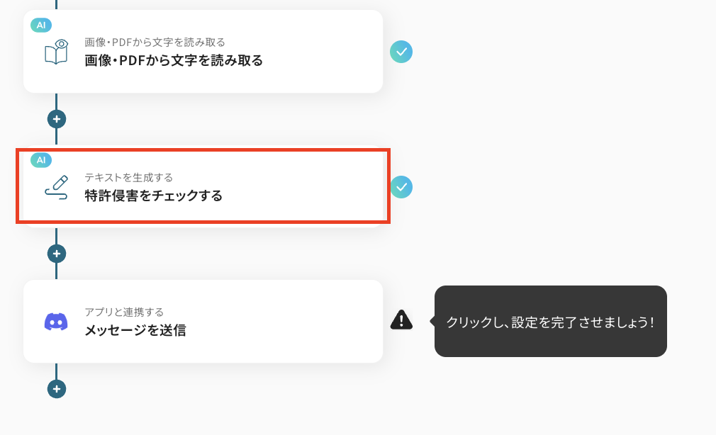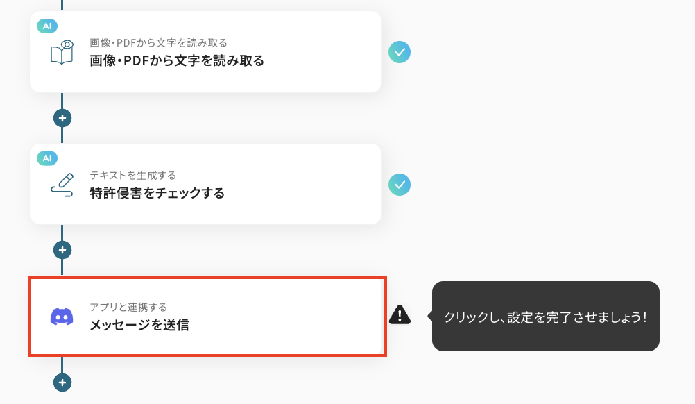 最後に、ステップ5で行った特許侵害のチェック結果を、Discordに送信する設定を行います。 「メッセージを送信」をクリックしてください。