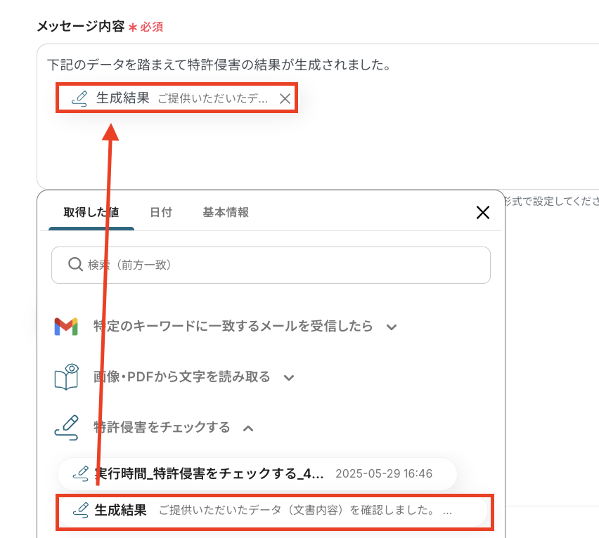「メッセージ内容」には、送信するメッセージの内容を自由に設定します。 「特許侵害の結果が生成されました。」など定型的な文章は直接入力し、特許侵害チェックの生成結果を引用する部分はアウトプットを使って設定しましょう。