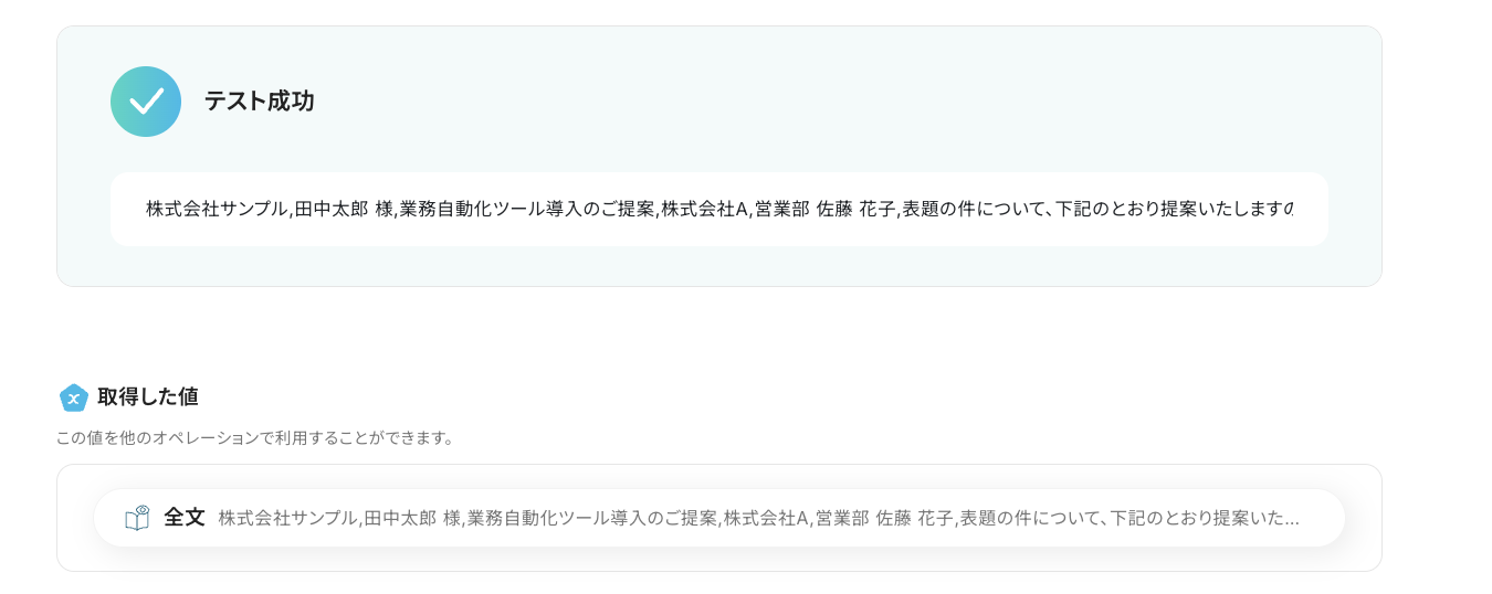 メールを送信したらYoomの画面に戻って「テスト」をクリックしましょう。 テストが成功すると、先ほどテスト送信したメールの内容が「取得した値」にアウトプットとして抽出されるので、内容を確認してくださいね!
