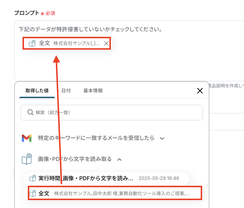 ・抽出したい項目 :ファイルから抽出したいテキストデータの項目を設定します。「会社名」や「日付」など、抽出したい項目をカンマ(,)区切りで入力してくださいね! 今回は「全文」を抽出して後続のフローで特許侵害をチェックしていくので、下図のように設定しています。