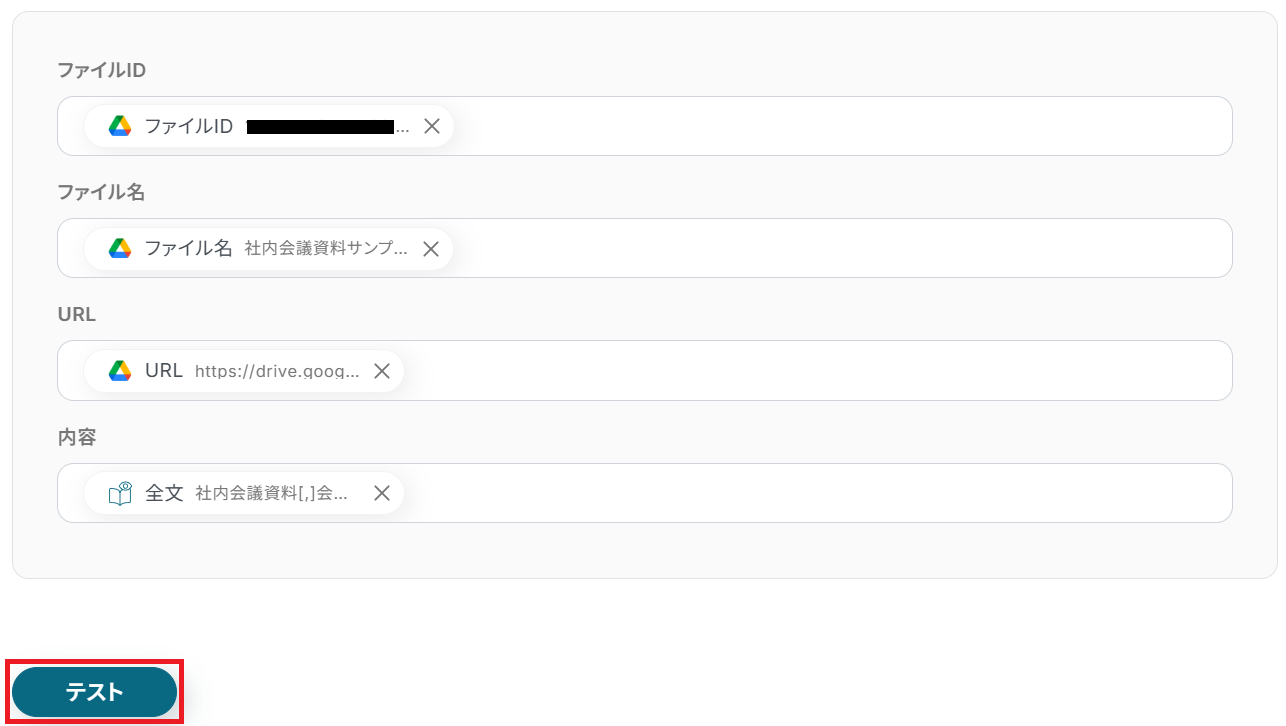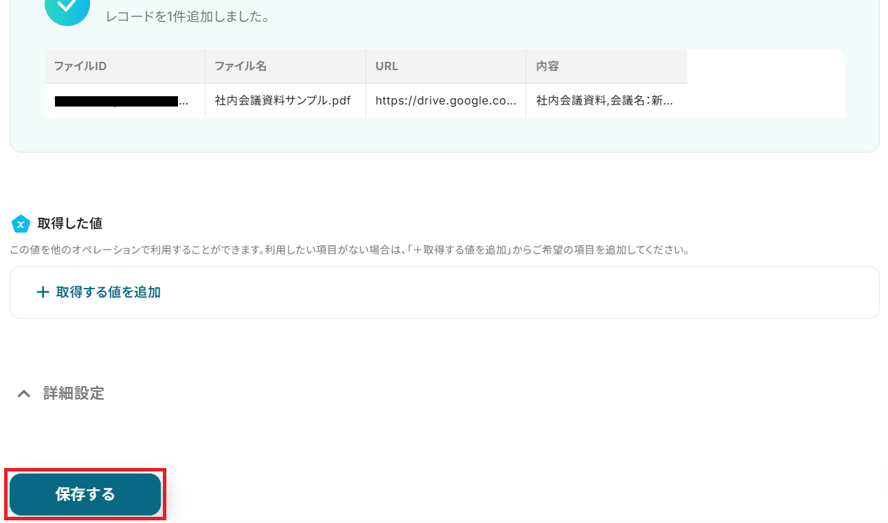 テストが成功すると取得した値が表示され、Google Driveのデータが確認できます。「保存する」をクリックして完了です!