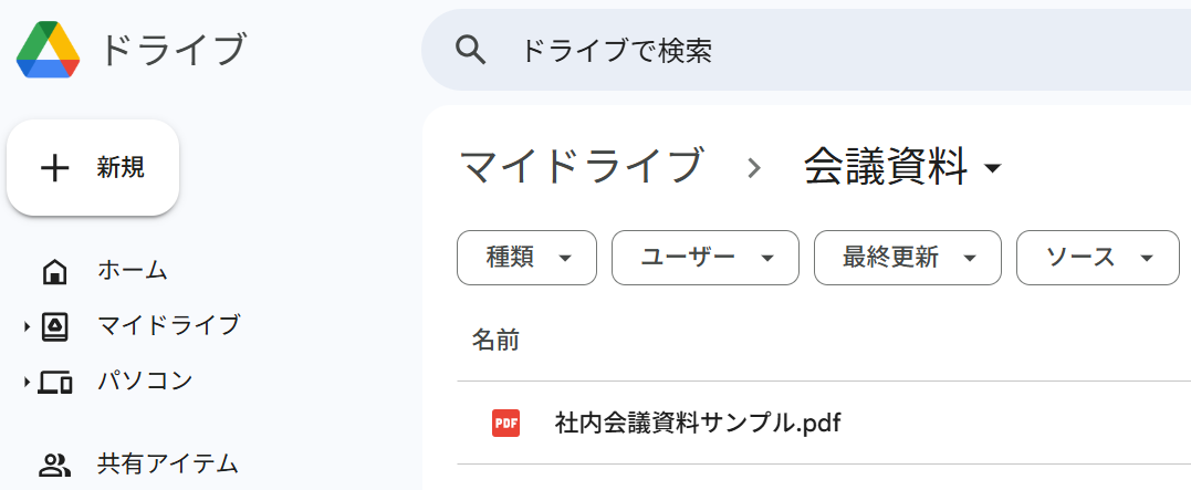 Yoomでの連携テスト時に必要になるため、事前準備として、Google Driveのフォルダにテスト用PDFファイルをアップロードしておきましょう。