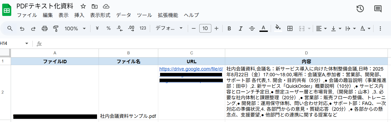 以上が、Google DriveにアップロードされたPDFをOCRで全文読み取り、Google スプレッドシートに追加する方法でした!