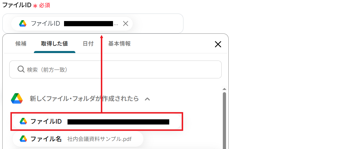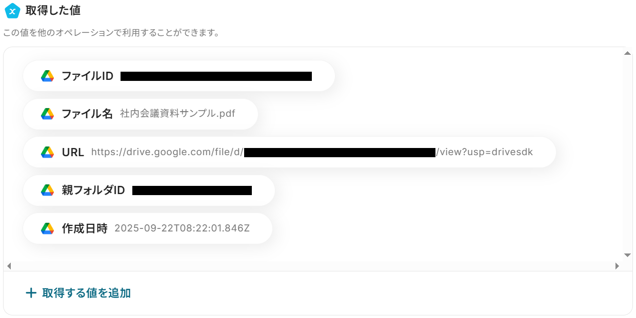 以下のようにGoogle Drive・OCR機能から取得した値を選択すると、ファイル情報やOCR結果を変数として反映させることができます。