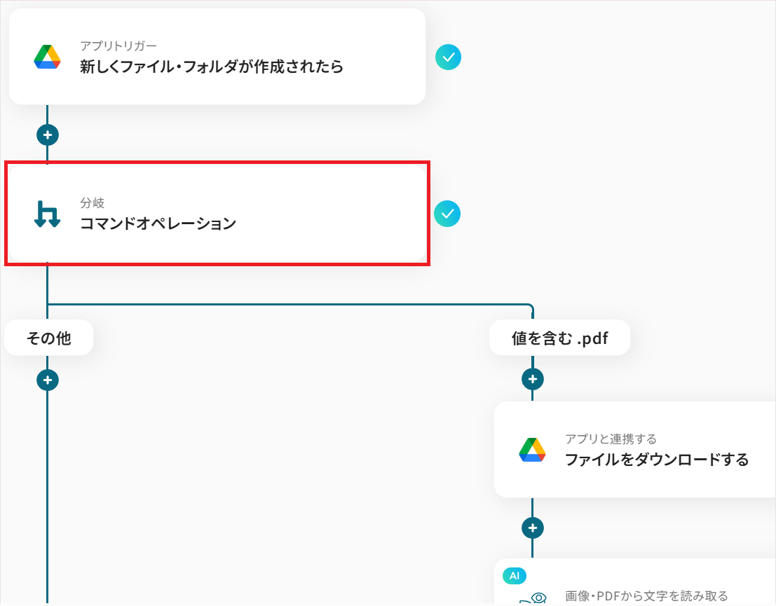 後続の処理に進むかどうか判別する設定をします。「コマンドオペレーション」をクリックしてください。