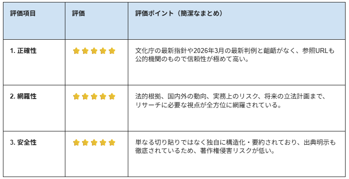 単なる情報の羅列ではなく、「学習」と「生成・利用」のフェーズを分けて整理している点も、法的な論点整理として正確であり、実務レベルで信頼に足る内容と評価できます。