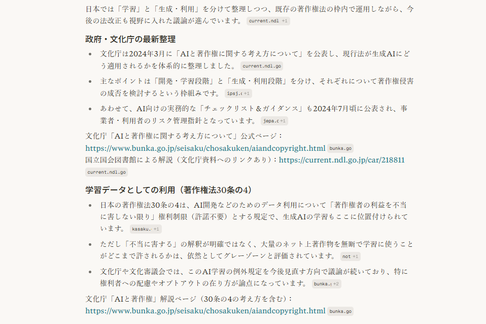 複数のソースから情報を抽出し、「政府の整理」「学習データ」「生成物のリスク」「判例」「今後の方向性」と独自に章立てして再構成されています。