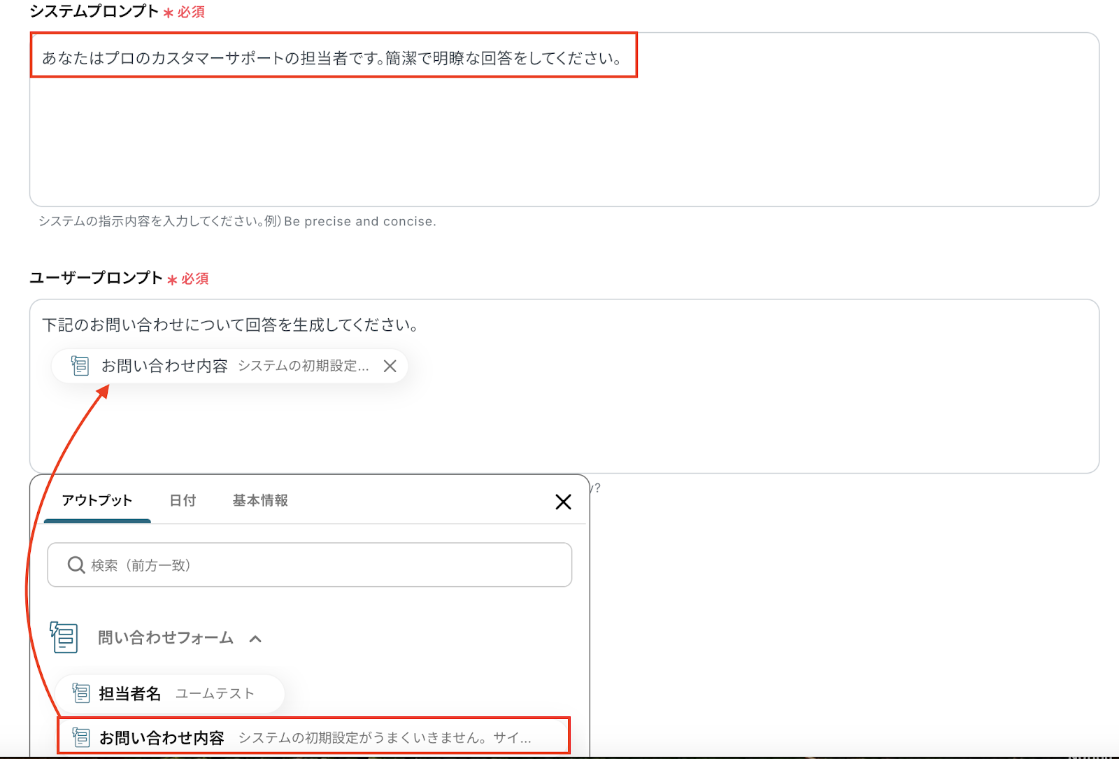 ユーザープロンプトには、フォームトリガーで設定した「お問い合わせ内容」をアウトプットから選択します。