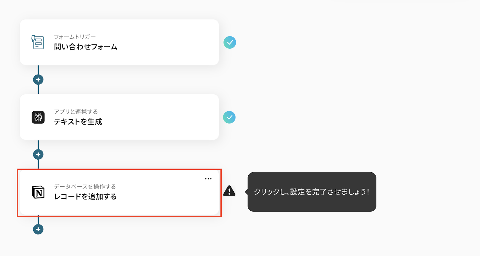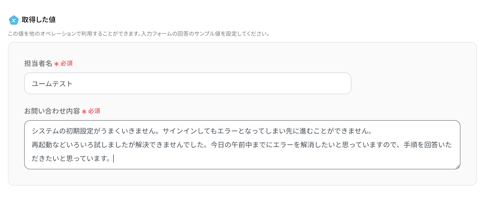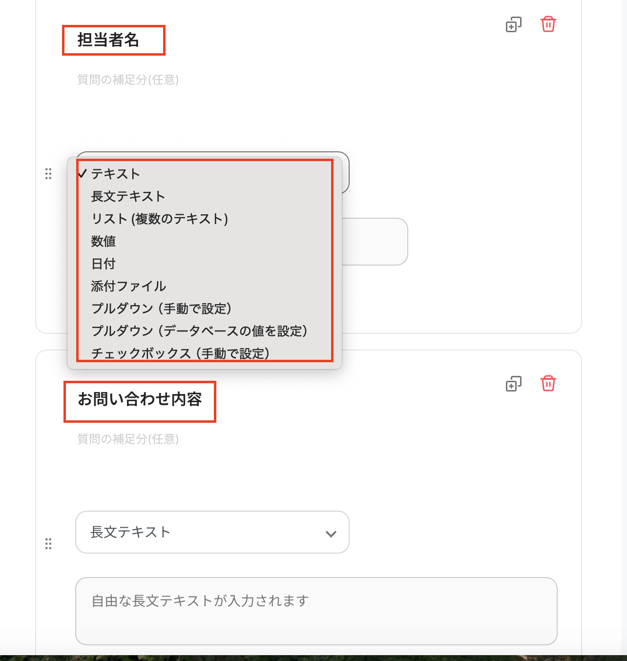 ここでは、「担当者」と「問い合わせ内容」と設定していますが、自由に変更してください。