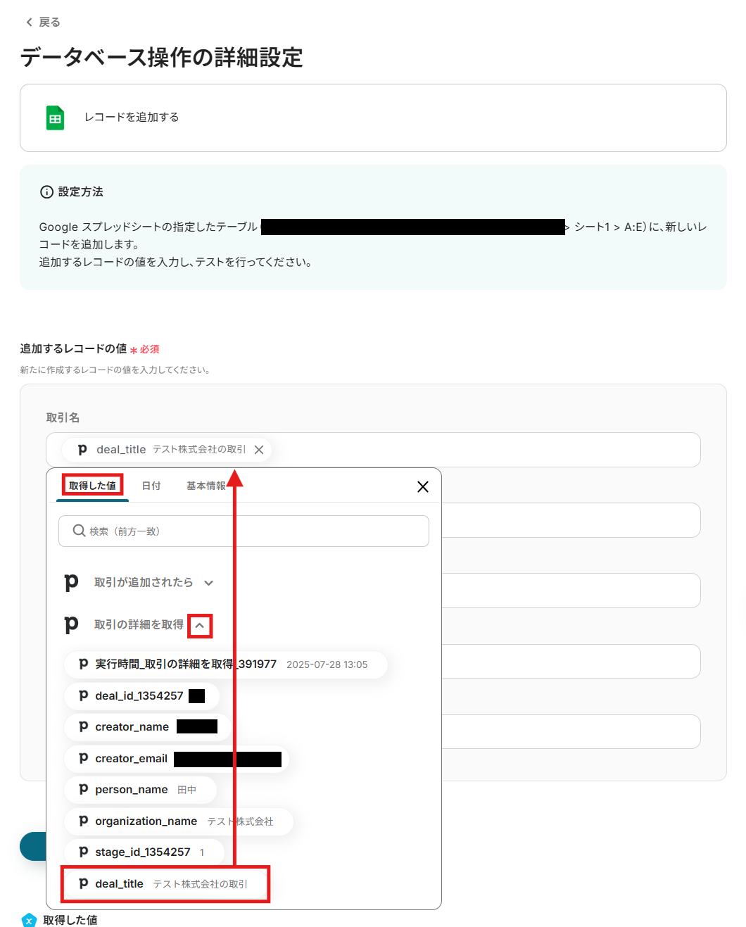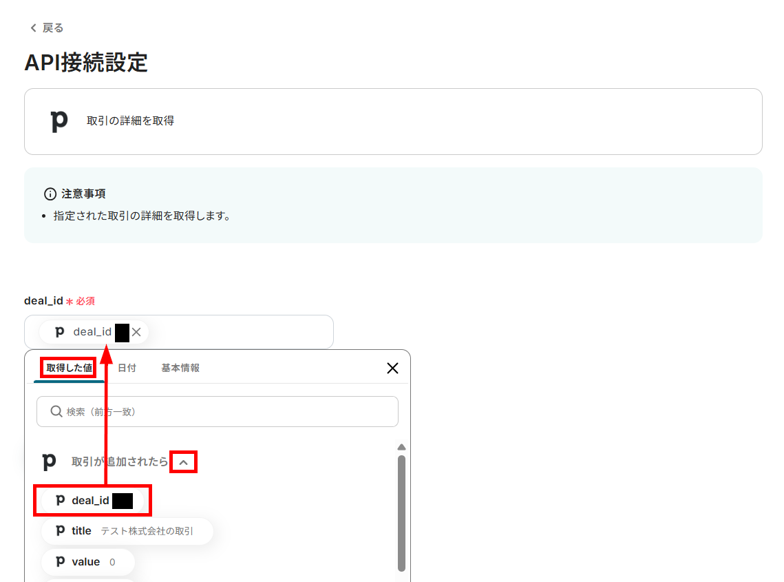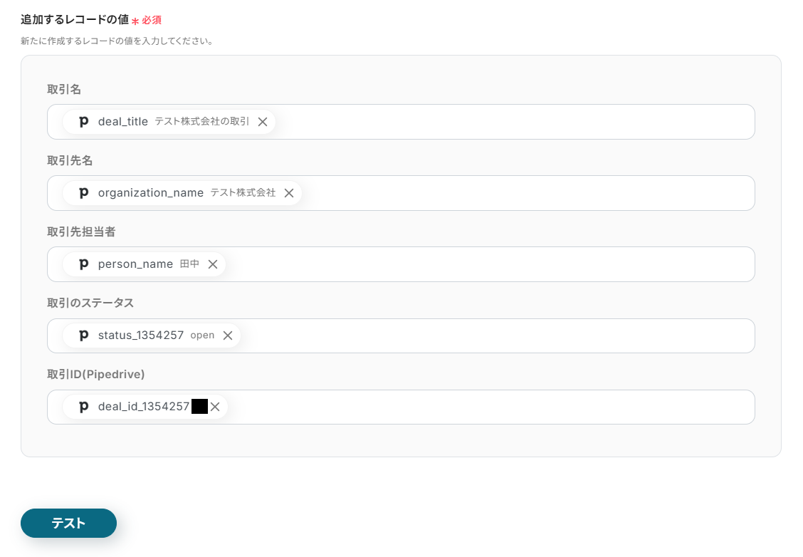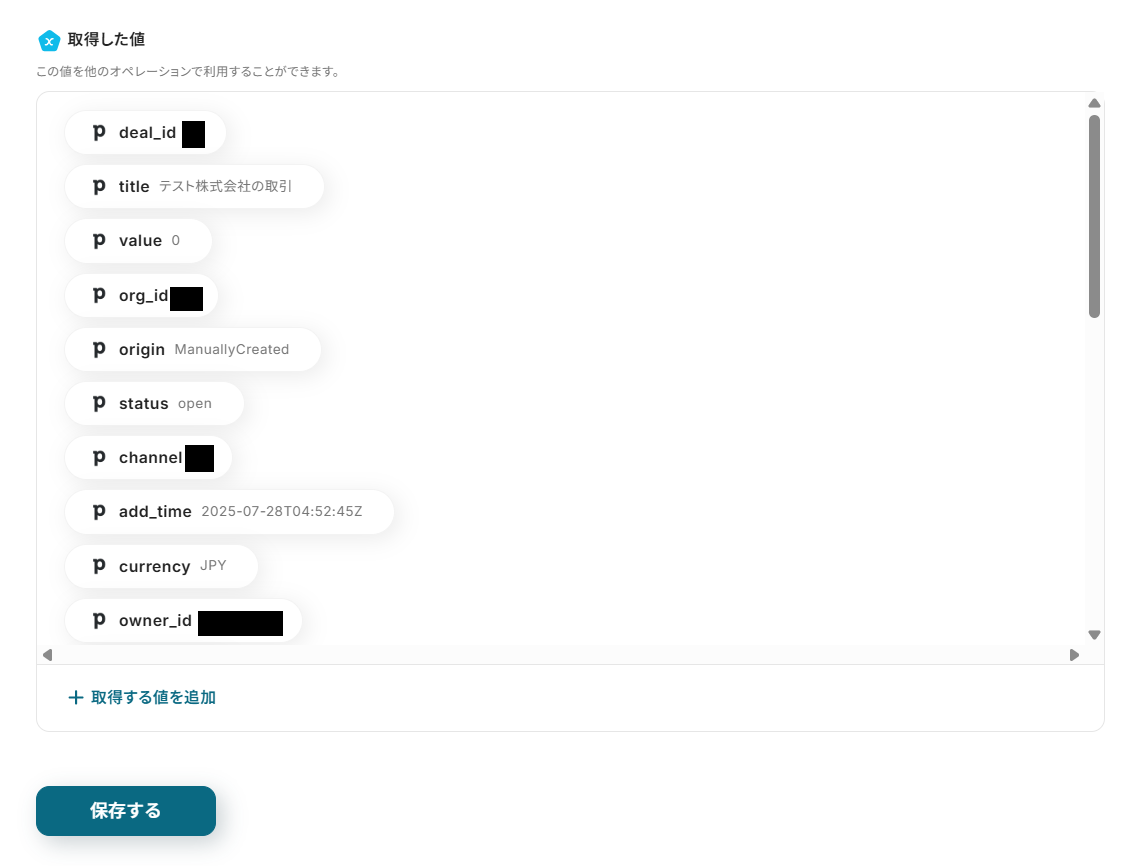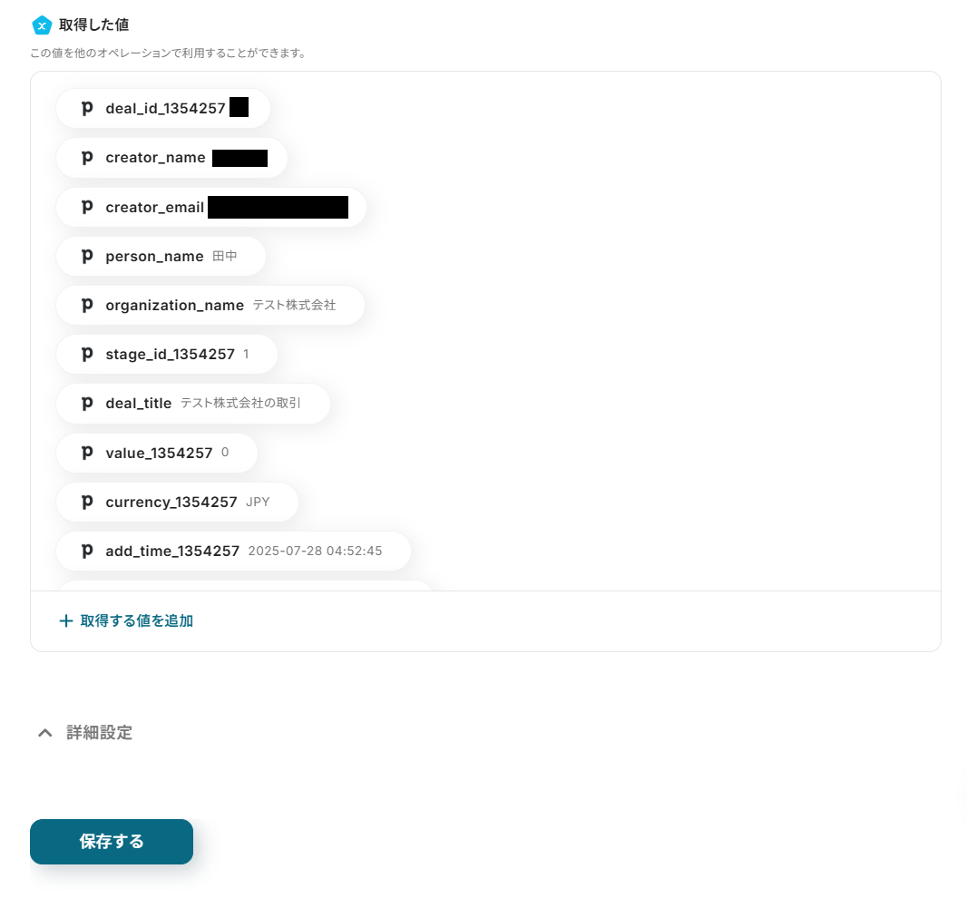 Pipedriveの情報を利用する場合は、取得した値から対応する項目を設定します。