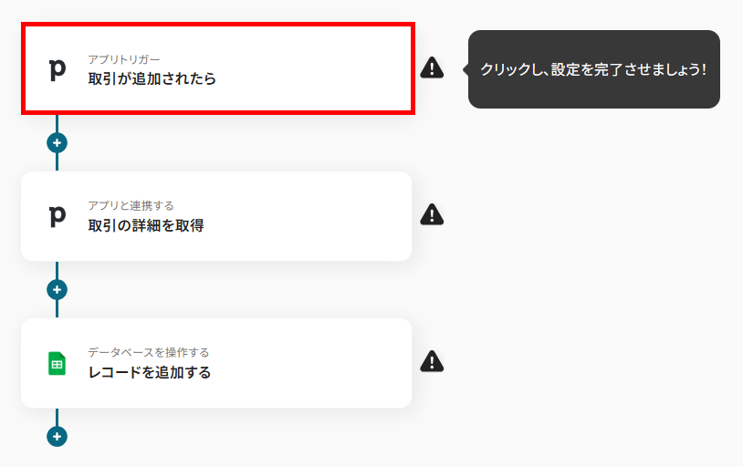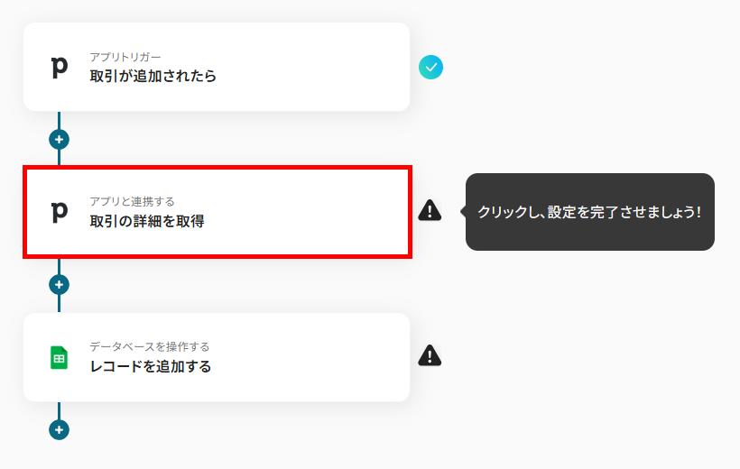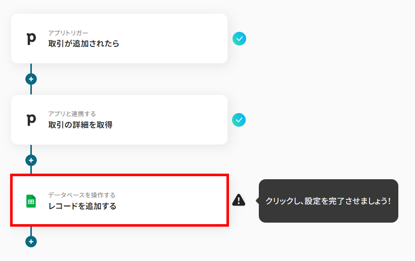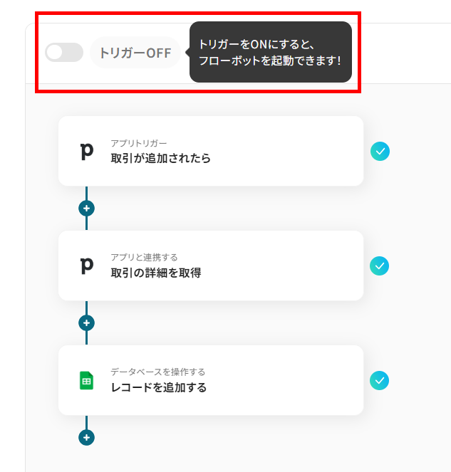 Pipedriveでの取引の追加をアクションの起点として、Google スプレッドシートへのデータ追加といった一連のフローを自動化できます。
