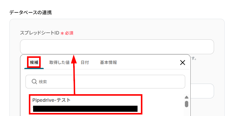 - スプレッドシートIDとスプレッドシートのタブ名は、候補から設定できます。