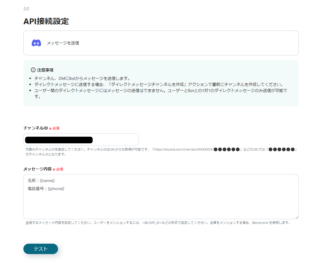 次の画面では、通知するDiscordのチャンネルIDとメッセージの設定をします。
