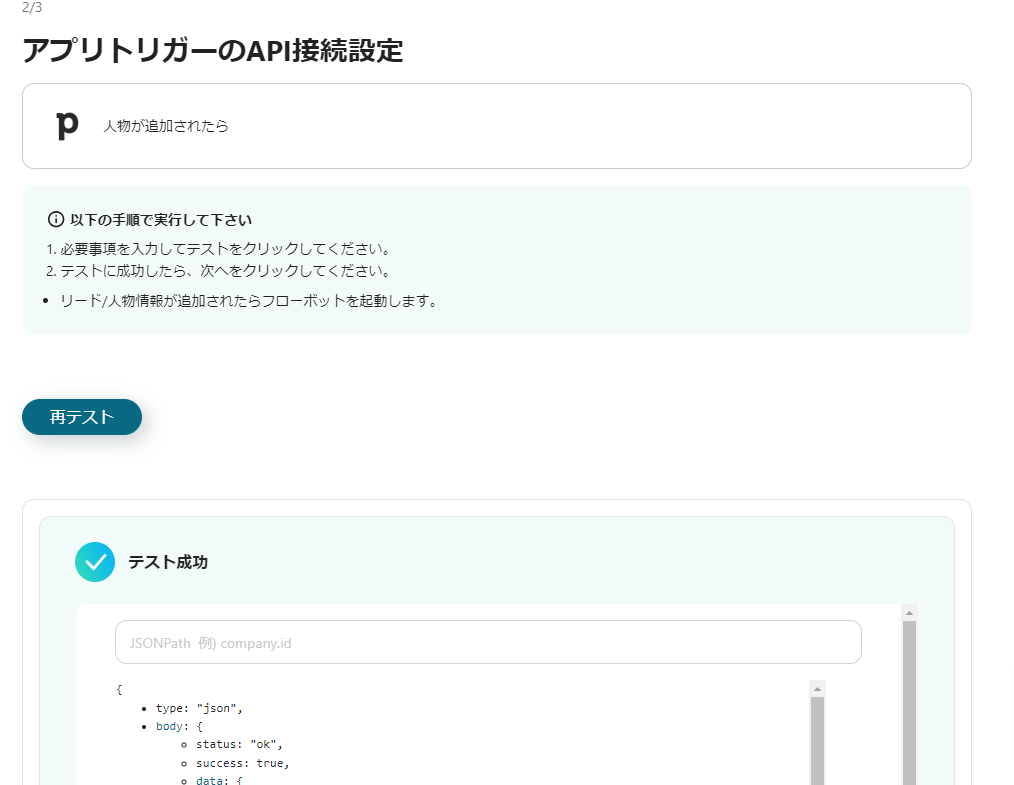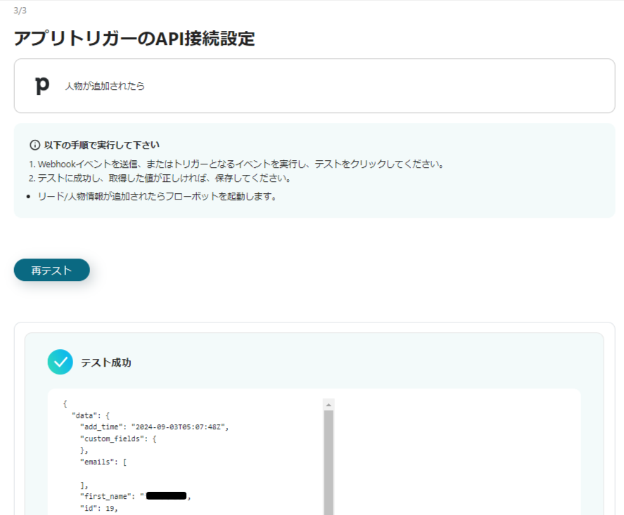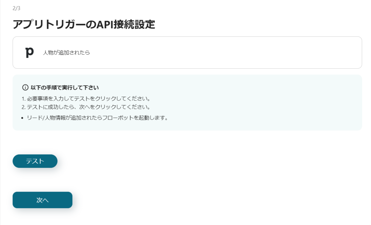 次の画面では、事前にPipedriveでリード情報が入力されていることを前提として「テスト」をクリックしてください。