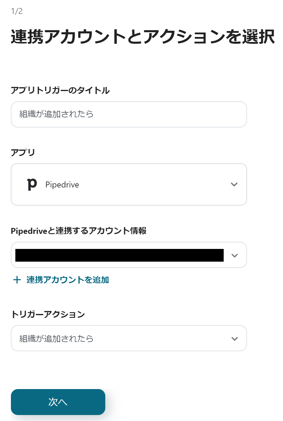 最初にPipedriveの設定から行うので、「組織が追加されたら」をクリックしてください。