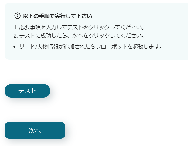 次のページでもテストのボタンを押します。青く「テスト成功」と表示されたら、保存を押せばPipedriveの設定は完了です。