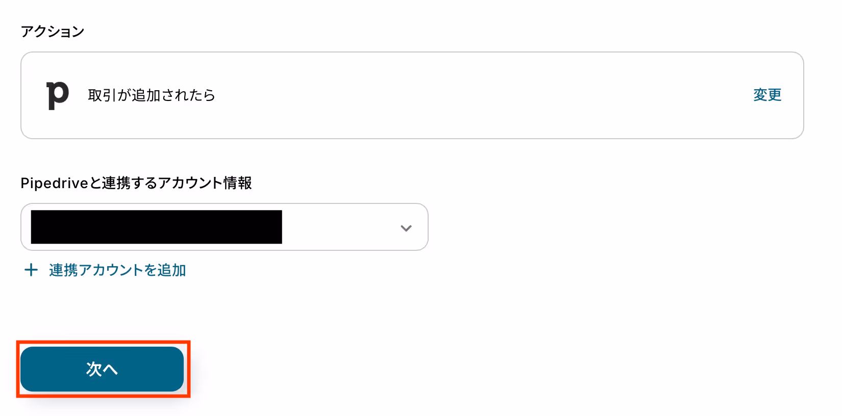 deal_idの項目で、前のステップ「取引が追加されたら」から取得したdeal_idを選択します。