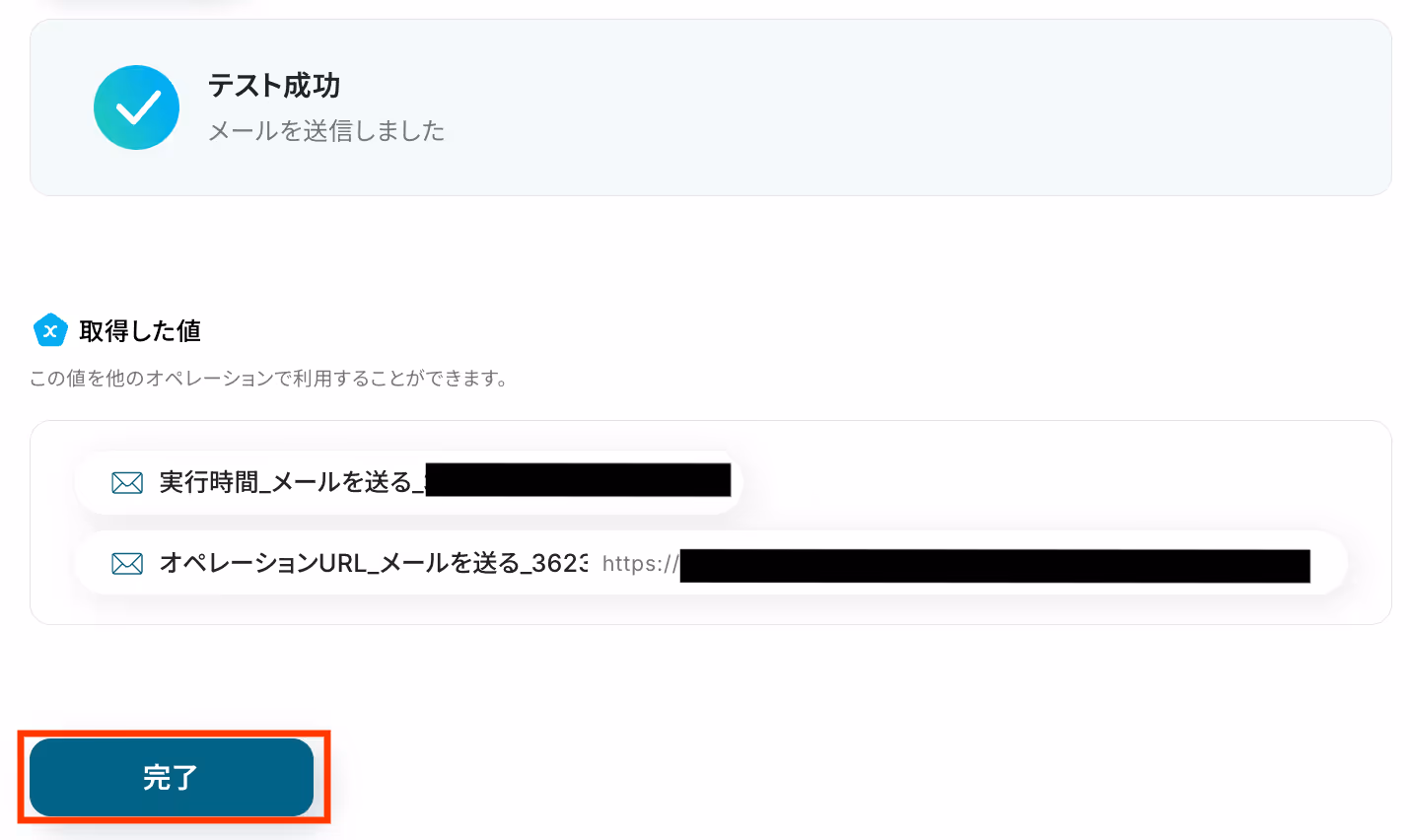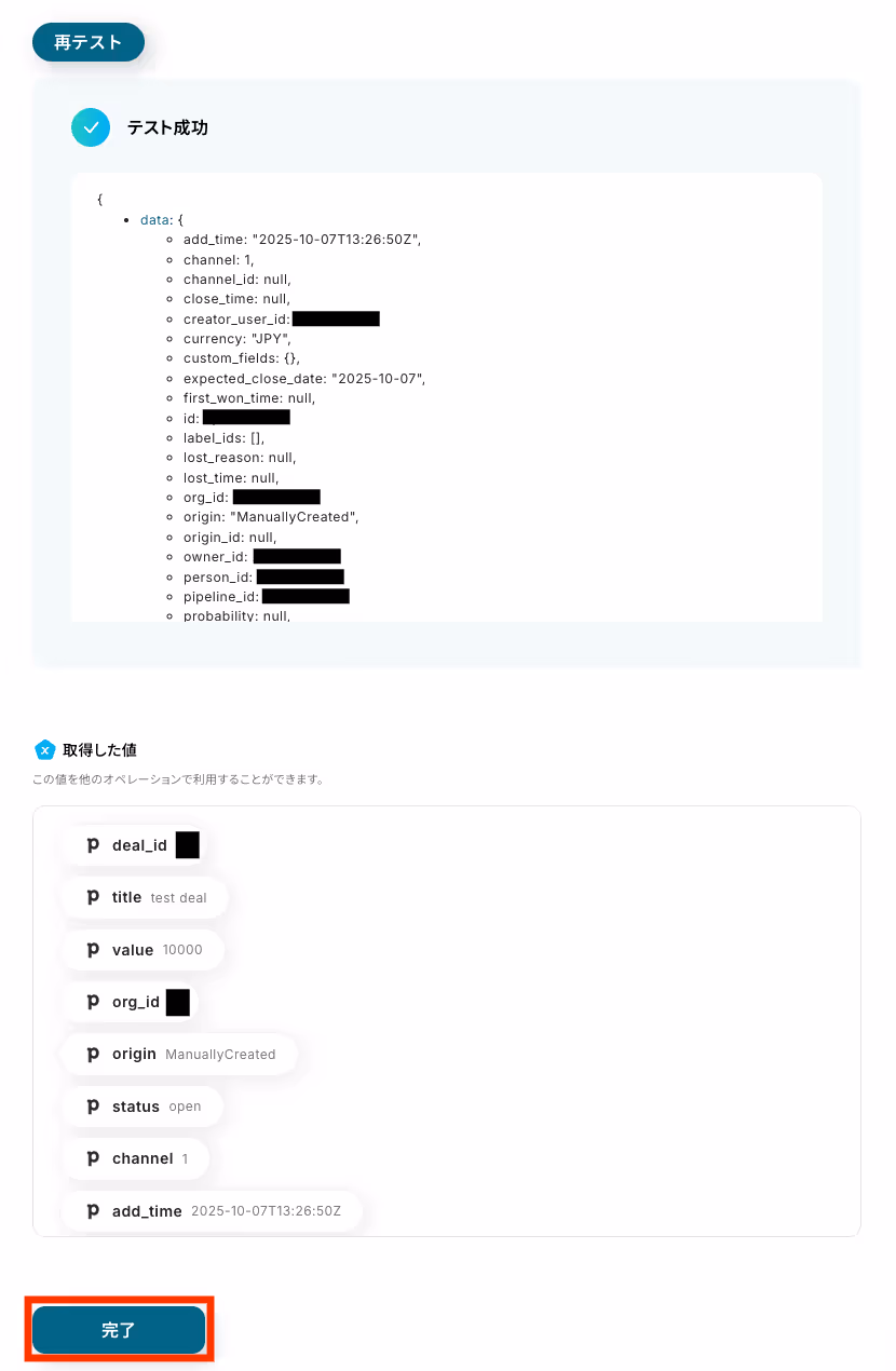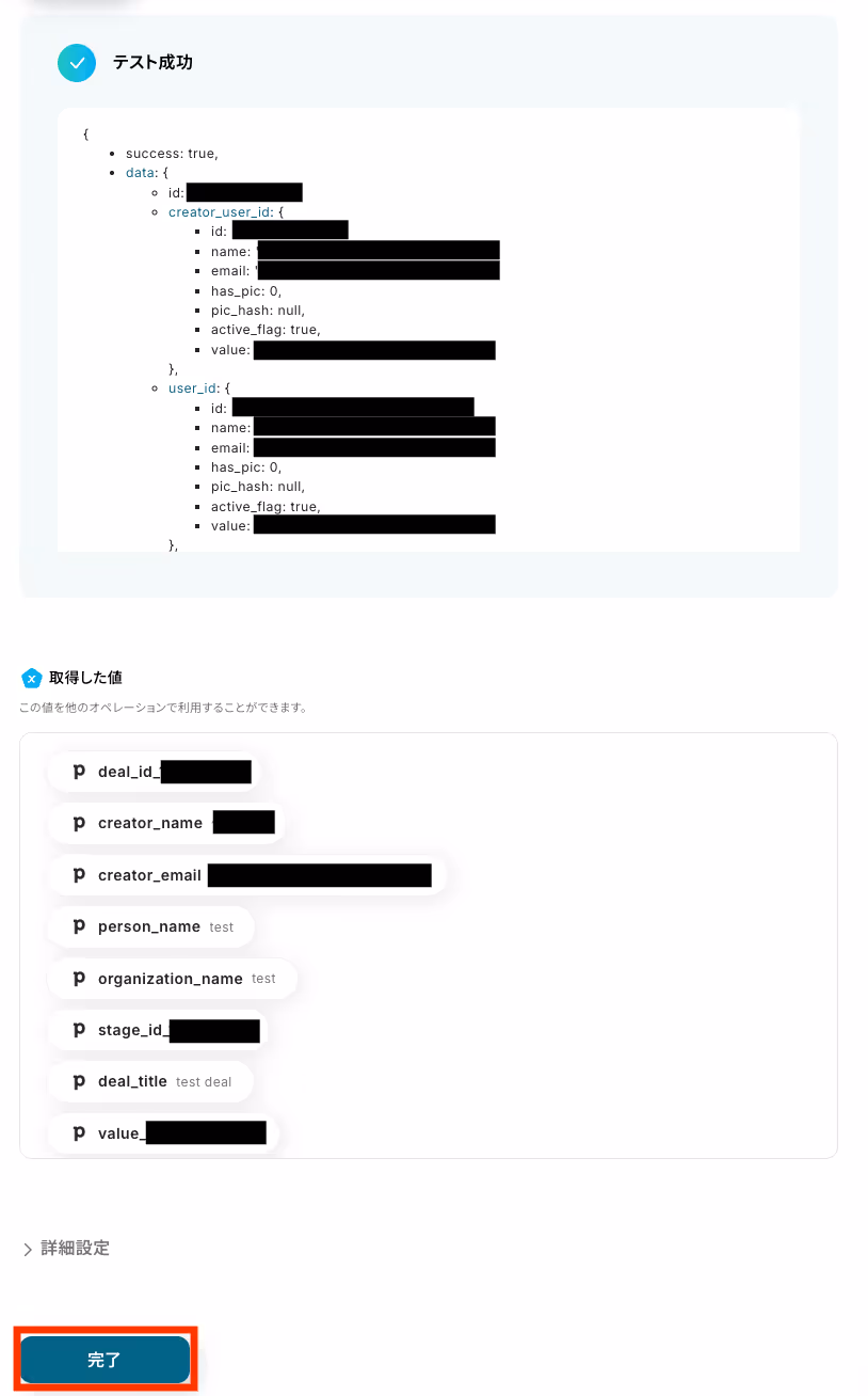 テストが成功するとテスト成功画面と取得した値が表示され、Pipedriveのデータが確認できます。「完了」をクリックしてこの次へ進みます!