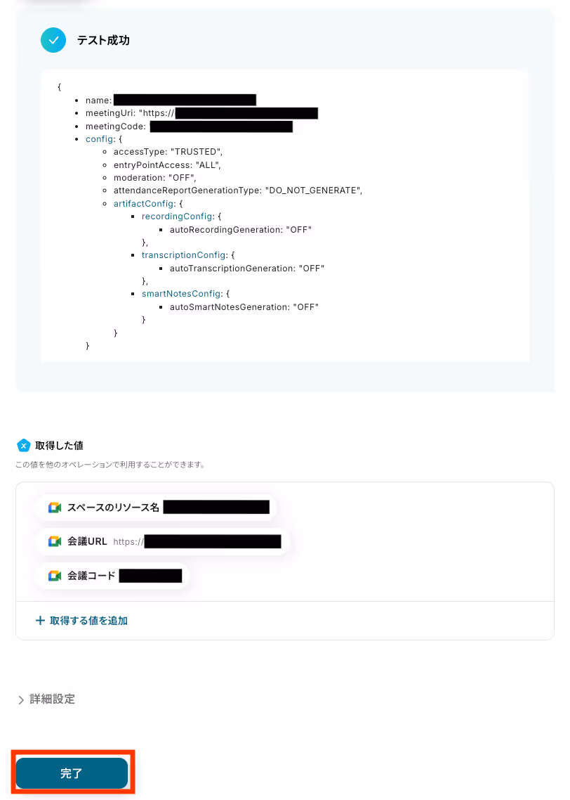 取得した値として「スペースのリソース名」「会議URL」「会議コード」が表示されます。