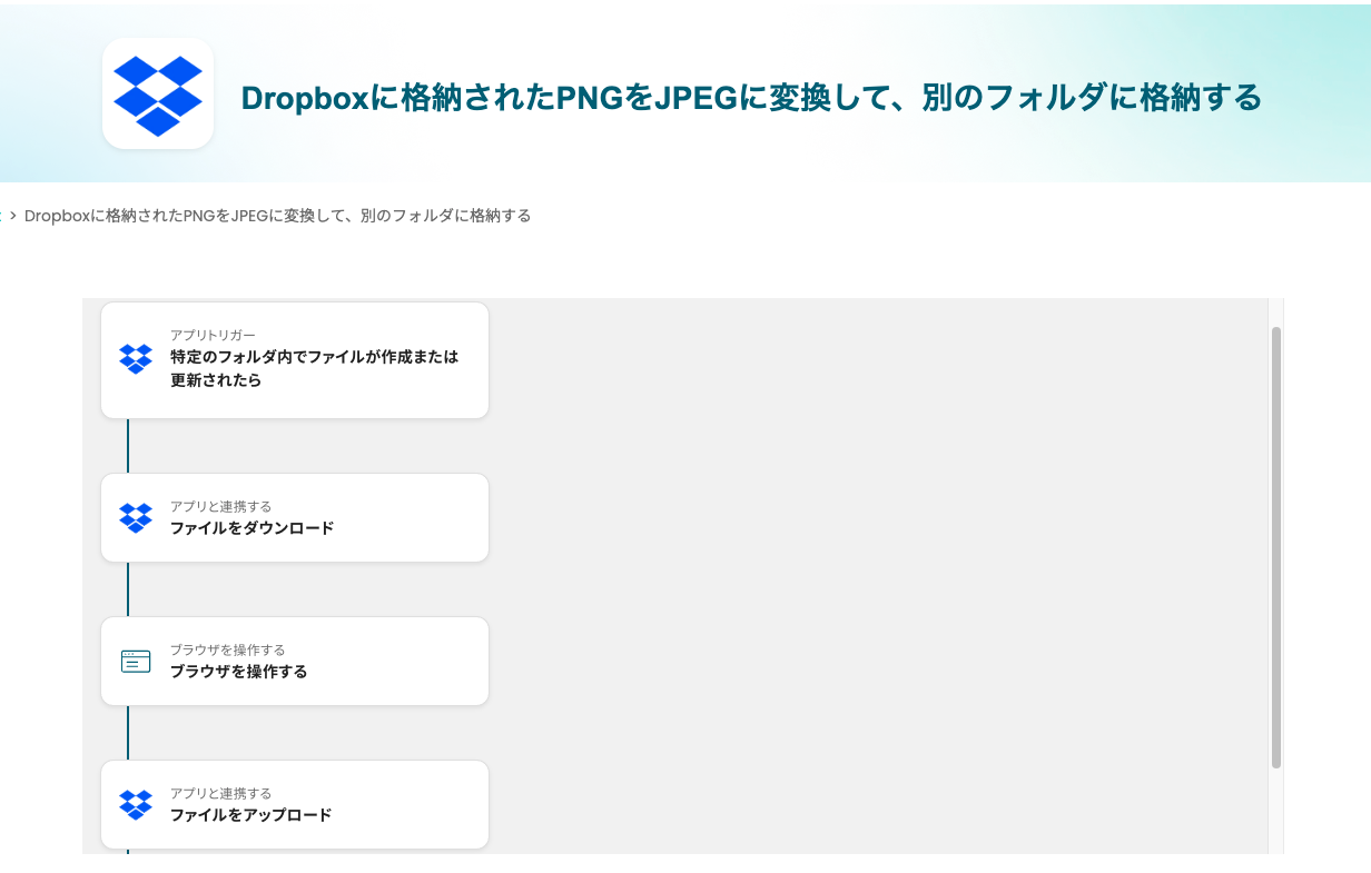 「Dropboxに格納されたPNGをJPEGに変換して、別のフォルダに格納する」ワークフローは、画像形式の変換作業を自動化します。