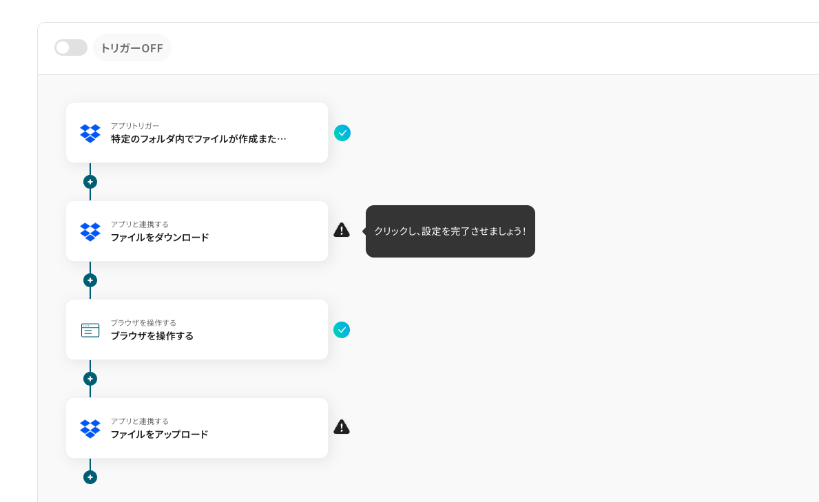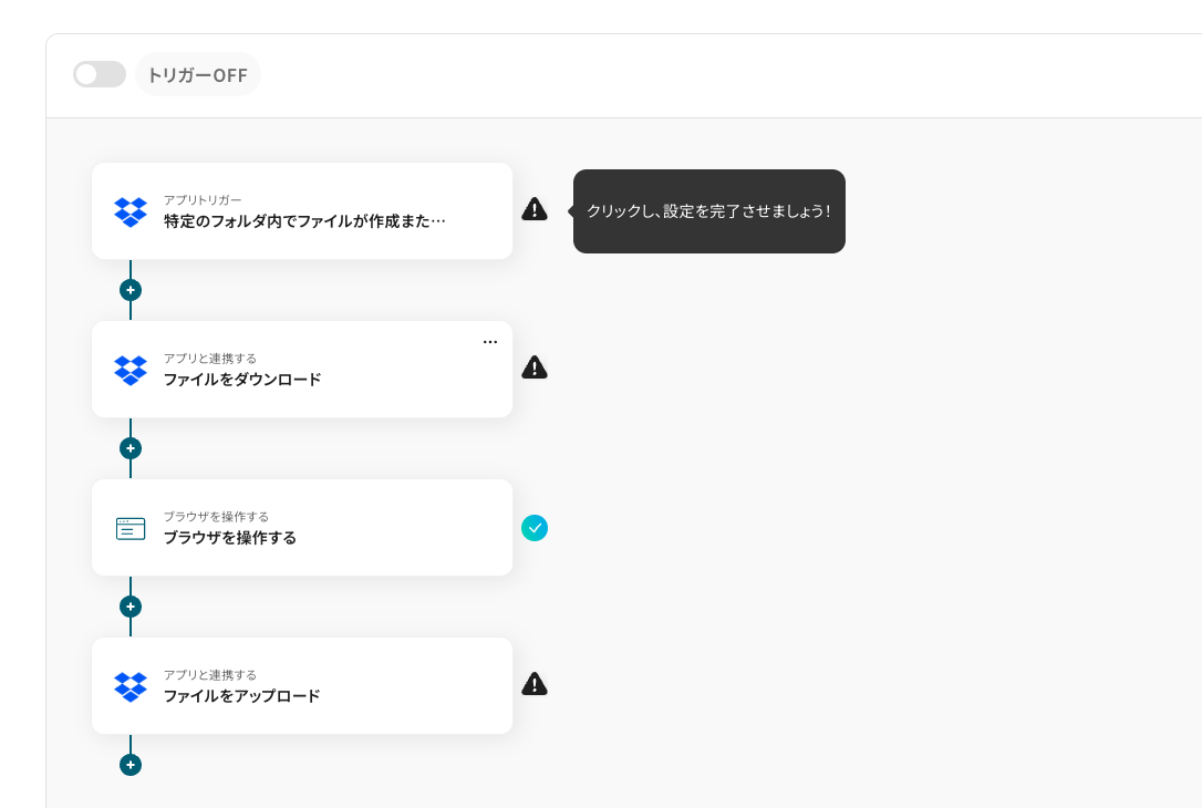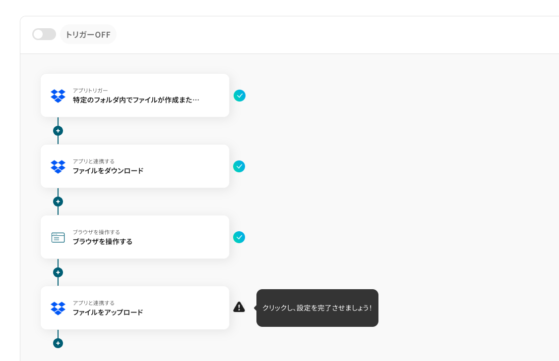 テンプレートの4つ目の工程をクリックします。この工程では、前の操作でJPEGに変換したファイルを、Dropboxの指定フォルダにアップロードします。