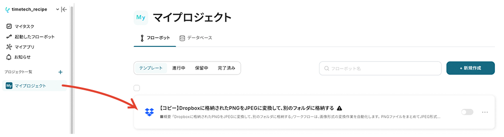 コピーしたテンプレートは、マイプロジェクトに追加されます。マイプロジェクトは左のメニューバーからアクセス可能です。
