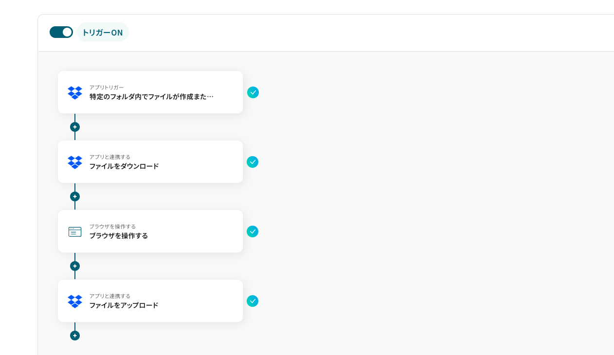 それではここから代表的な例として、Dropboxの特定フォルダにPNGファイルが追加された際に、自動でJPEG形式に変換し、別の指定フォルダに格納するフローを解説していきます!