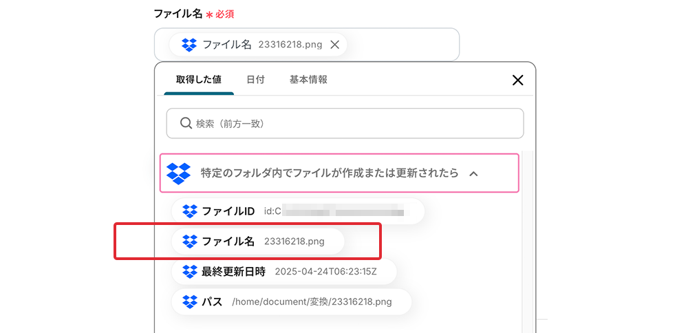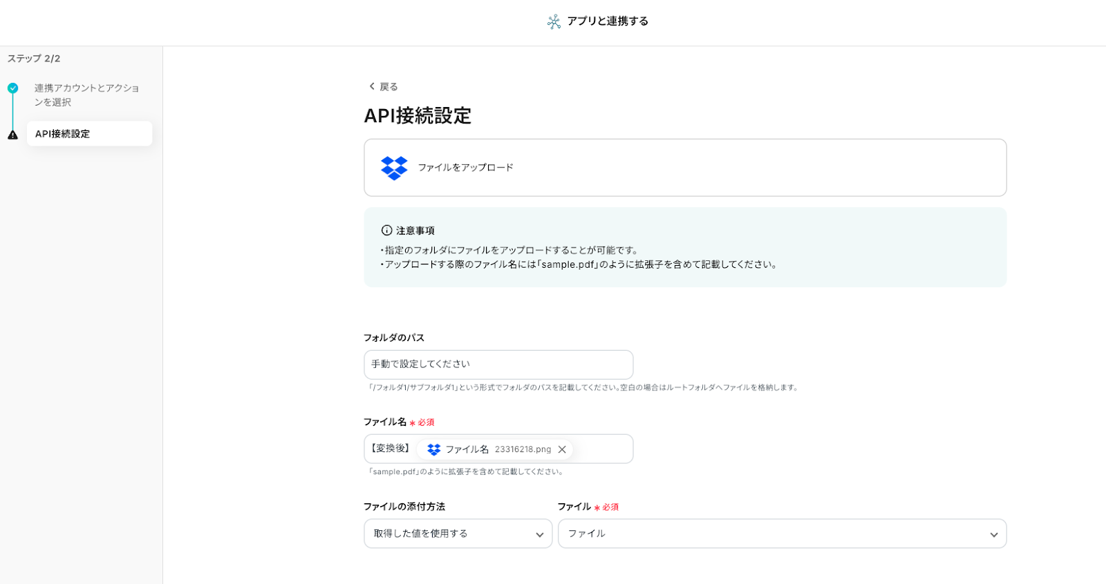 - Dropboxのアクション設定(変換後のファイルの保存先フォルダを指定)