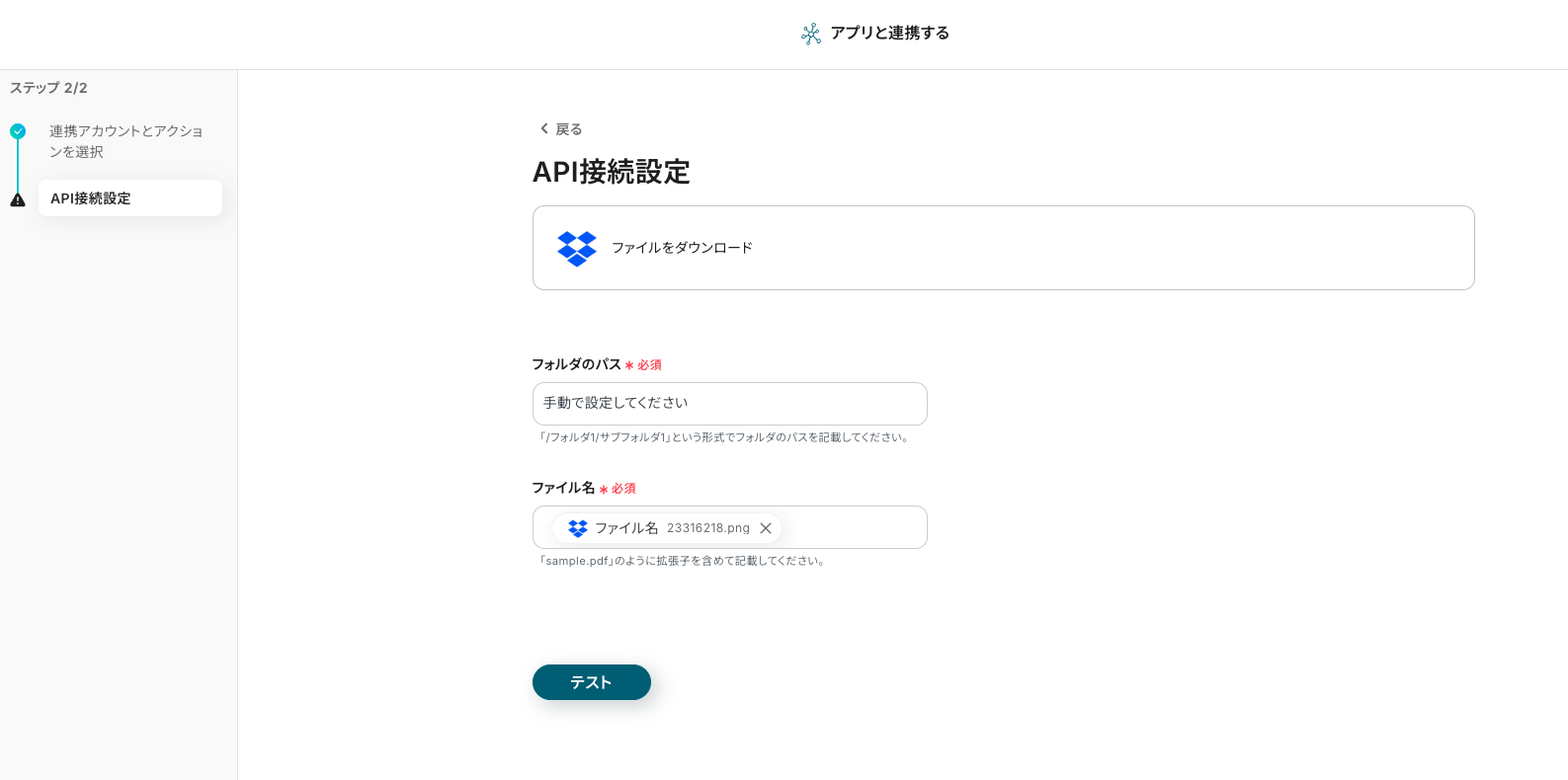 テストボタンをクリックします。成功すると、テストでアップロードしたファイルをフローボットがダウンロードできたことが表示されます。
