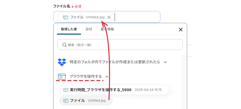- 前の操作で取得した、JPEGファイルの引用コードを埋め込みます。編集欄をクリック<プルダウンメニュー<取得した値<ブラウザを操作するの中から、ファイルを選択すると、引用コードが埋め込まれます。