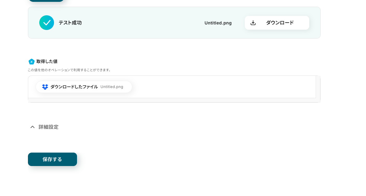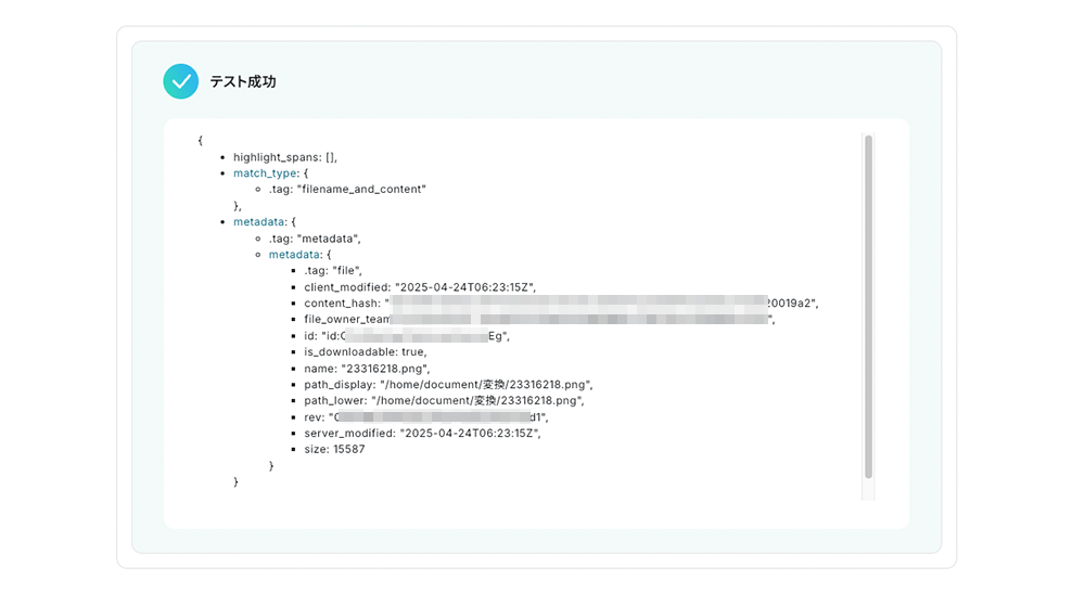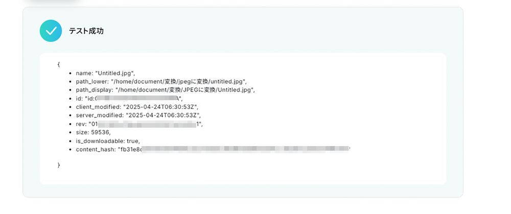 これは、YoomがDropboxに正しくつながり、指定の画像ファイルの情報が問題なく取得できていることを示すテスト結果です。【ダウンロード可能か:はい、可能です(is_downloadable: true)】と記載されています。