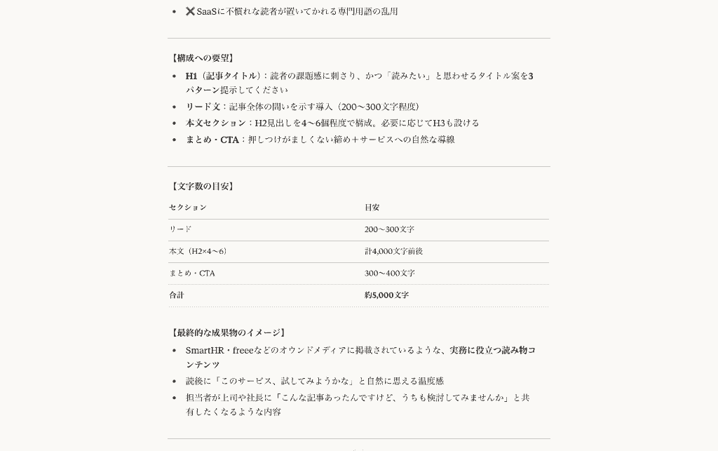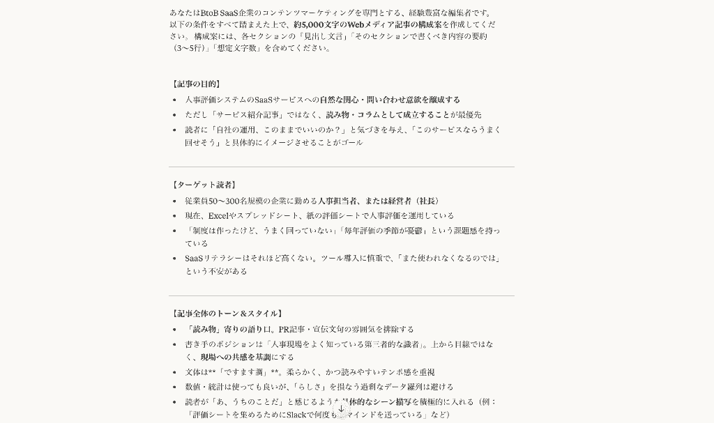 今から投稿する「ふわっとした要望」をもとに、AIが高い精度で記事構成案を作れるような「プロンプト(指示書)」に翻訳してください。 ・目的 ・ターゲット ・記事全体のトーン&スタイル ・必ず入れてほしいポイント ・避けたい表現・NG事項 ・構成(見出しレベル)の要望 などを整理しつつ、「このプロンプトをAIに渡したら、かなり的確な構成案が返ってきそうだな」と思えるレベルまで具体化してください。 出力フォーマットは自由ですが、編集者がそのまま使える“指示書テキスト”として完成させてください。 以下口頭メモ