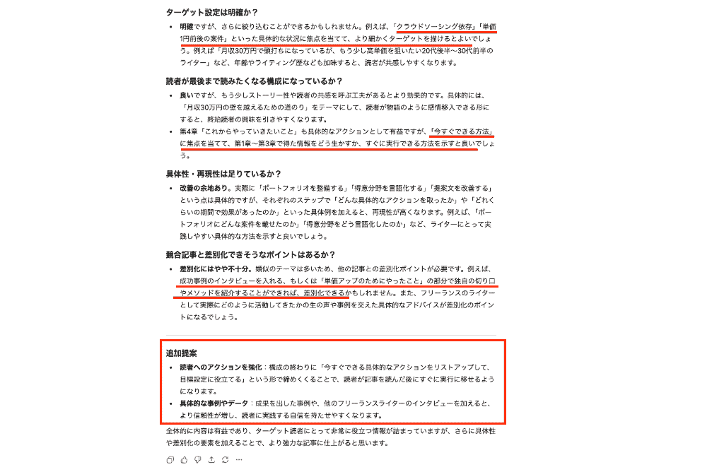 あなたはBtoBメディアの編集長です。 以下は、フリーランスWebライター向けの記事構成案です。 (ここに上記の構成案をコピペ) この企画の弱点や不十分だと思う点を教えてください。 特に、次の観点でコメントをお願いします。 ターゲット設定は明確か? 〜(省略)〜 分析結果の提示は的確で、ターゲット設定においては、現状でも問題ないが「具体的な状況に焦点を当てるとさらによくなる」だったり、「類似記事が多いので別の切り口を入れた方が良い」などの現実的なアドバイスが得られました!(赤線、赤枠)