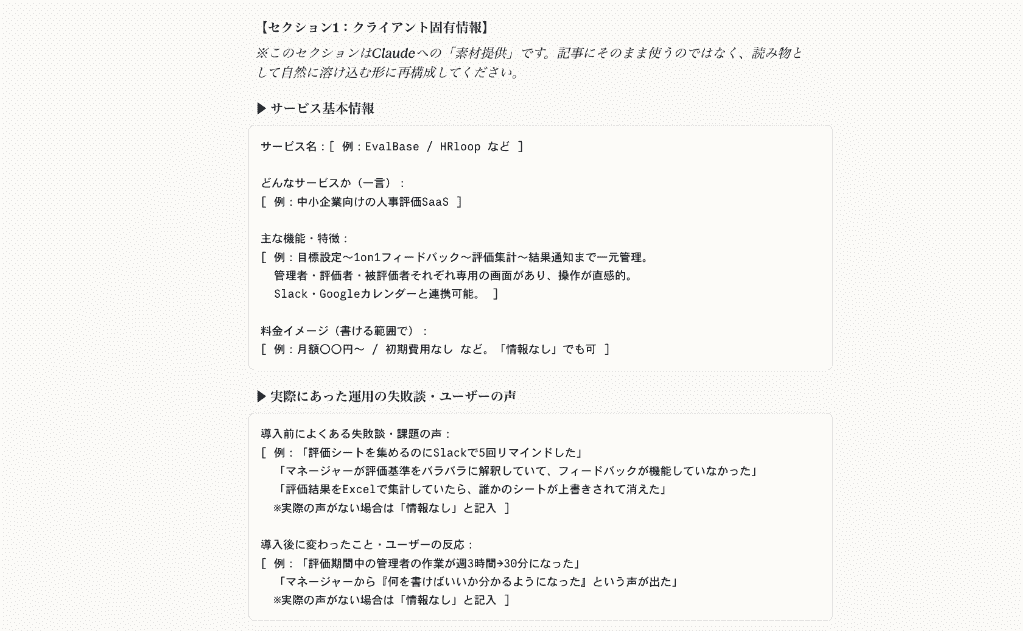 3. 曖昧なクライアント要望から精緻な構成案への「翻訳」 最後に試したのが、Claude を使った、クライアントからの「ざっくりとした指示」を形にするプロセスへの導入です。