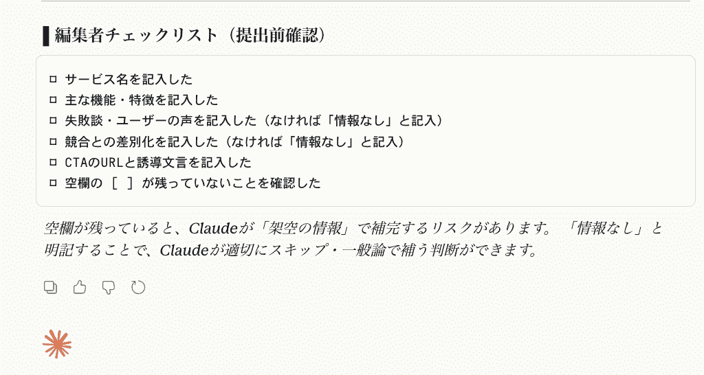 最下部には編集時のチェックリストも提示されており、指示以上の働きを見せてくれています。