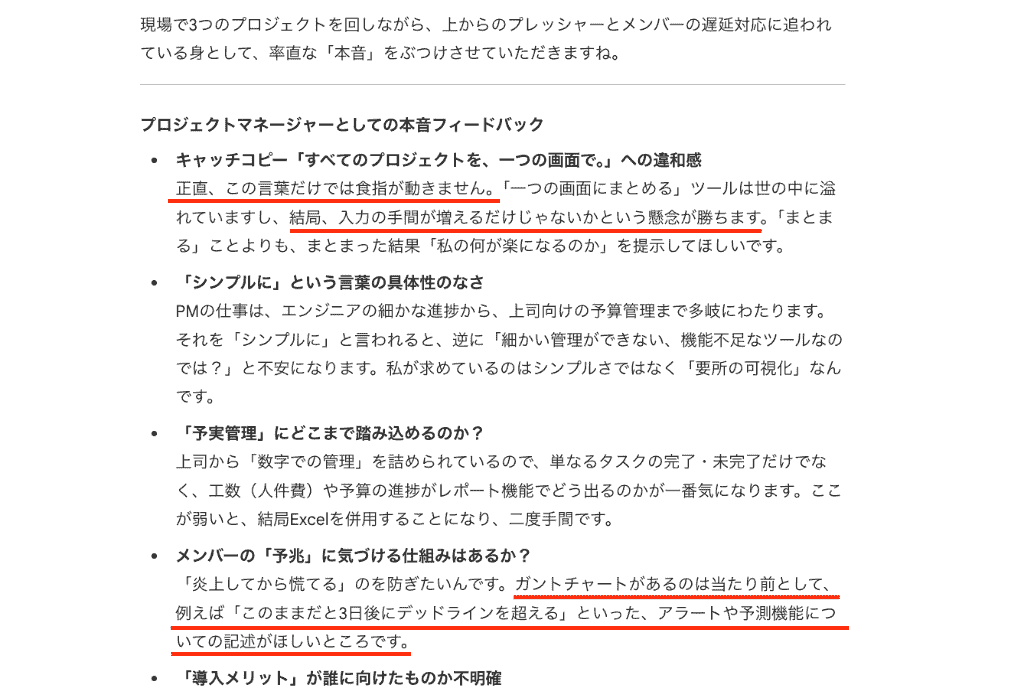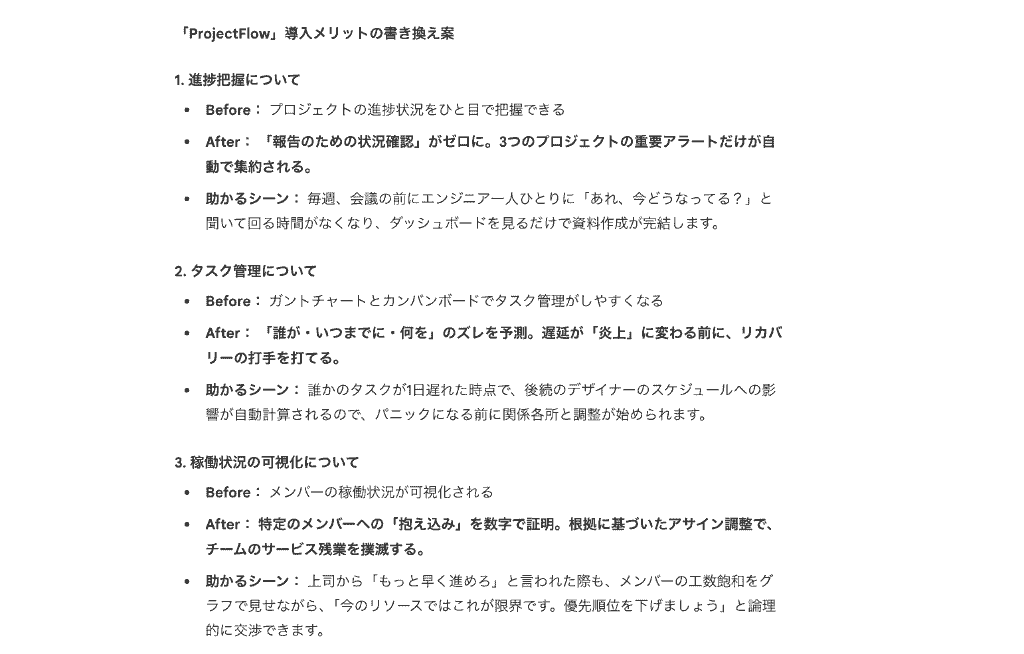 あなたは、次のような人物です。 (「ペルソナ設定」をコピペ) 今からお見せするのは、とあるプロジェクト管理ツール「ProjectFlow」の提案資料のたたき台です。 上記を読んだ「ペルソナ本人」として、率直な感想・疑問・モヤモヤを出してください。 ・箇条書きで5〜10個 ・「ここがよくわからない」「ここが刺さる/刺さらない」という視点で、キャッチコピーと「導入メリット」の部分について気になった点を詳しく教えてください。 投稿後、2秒ほどで回答が得られました。