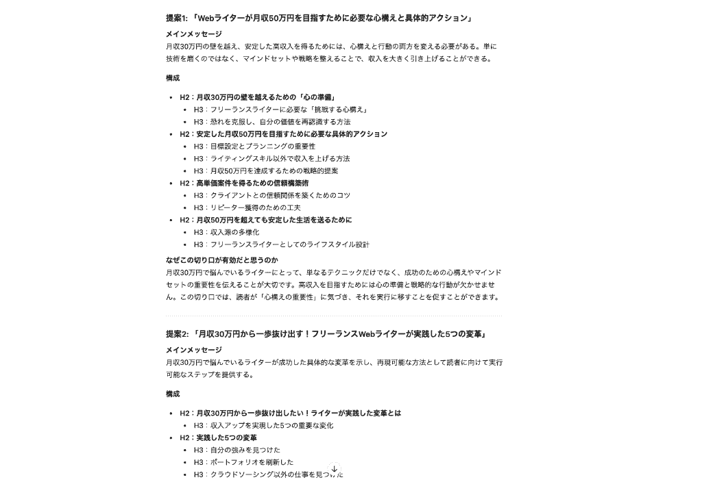 他にも、「「別の切り口」の記事企画を3つ提案してください。」と指示してみましたが、「月収30万」に固執しない『月収50万を目指し、かつ安定した生活を送るためには?』という新たな切り口を提案してくれました。