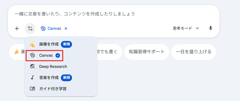 プロンプト入力欄の近くにある「ツール(Tools)」ボタンをクリックし、その中から「Canvas」を選択して機能を有効にしましょう。