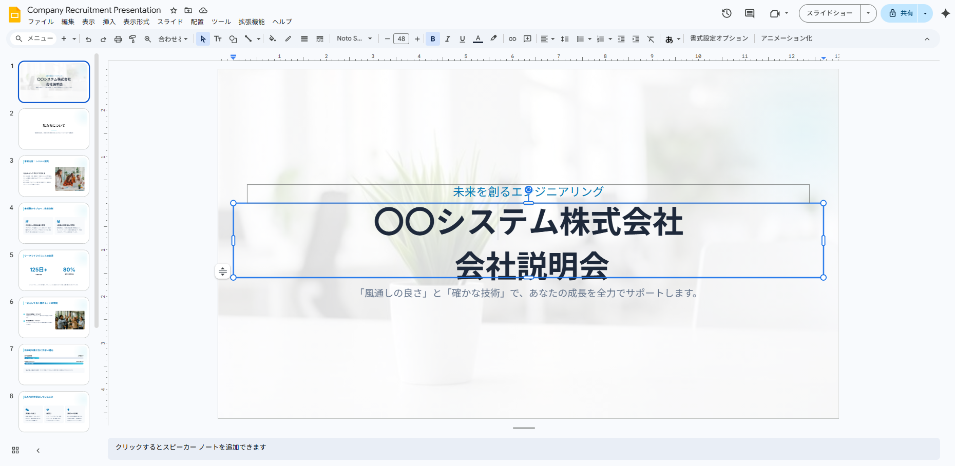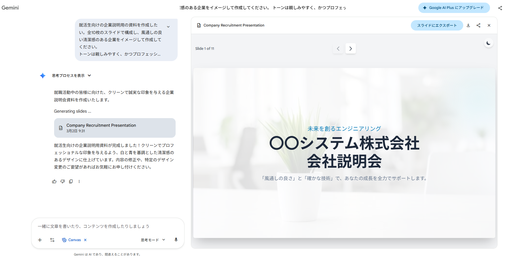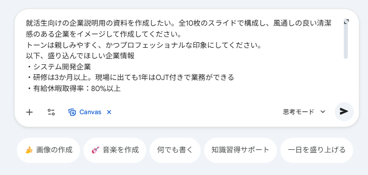 実際にCanvas機能を使って、Googleスライドを作成する手順を紹介します。ここでは例として、「会社説明会用の資料」を作成する流れを見ていきましょう。