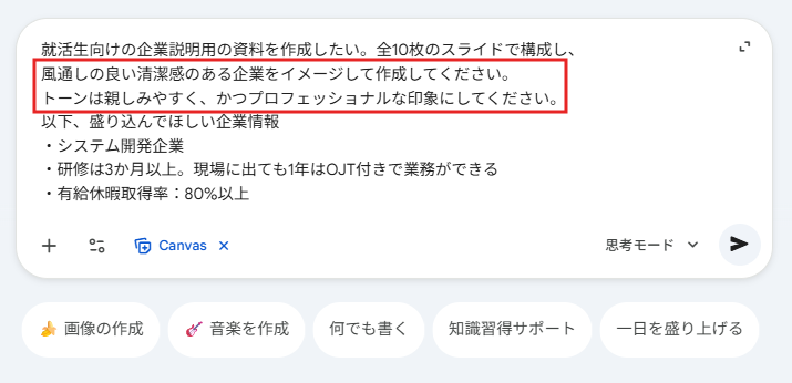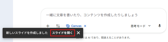 また、今回はGemini 3の思考モードを使用してスライドを作成していきます。無料プランでの利用は、システム負荷や利用状況によって1日の生成回数に上限(利用制限)がかかる場合があるため、その点に留意して進めましょう。