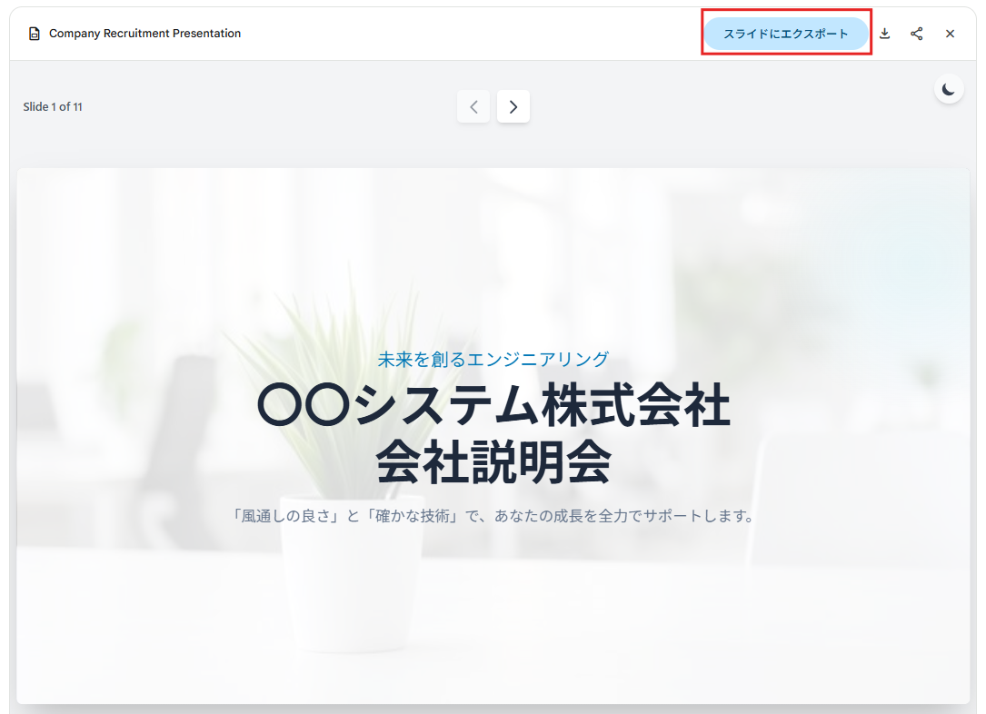 作成した内容は、ボタン一つでGoogleスライド形式としてエクスポートすることも可能です。