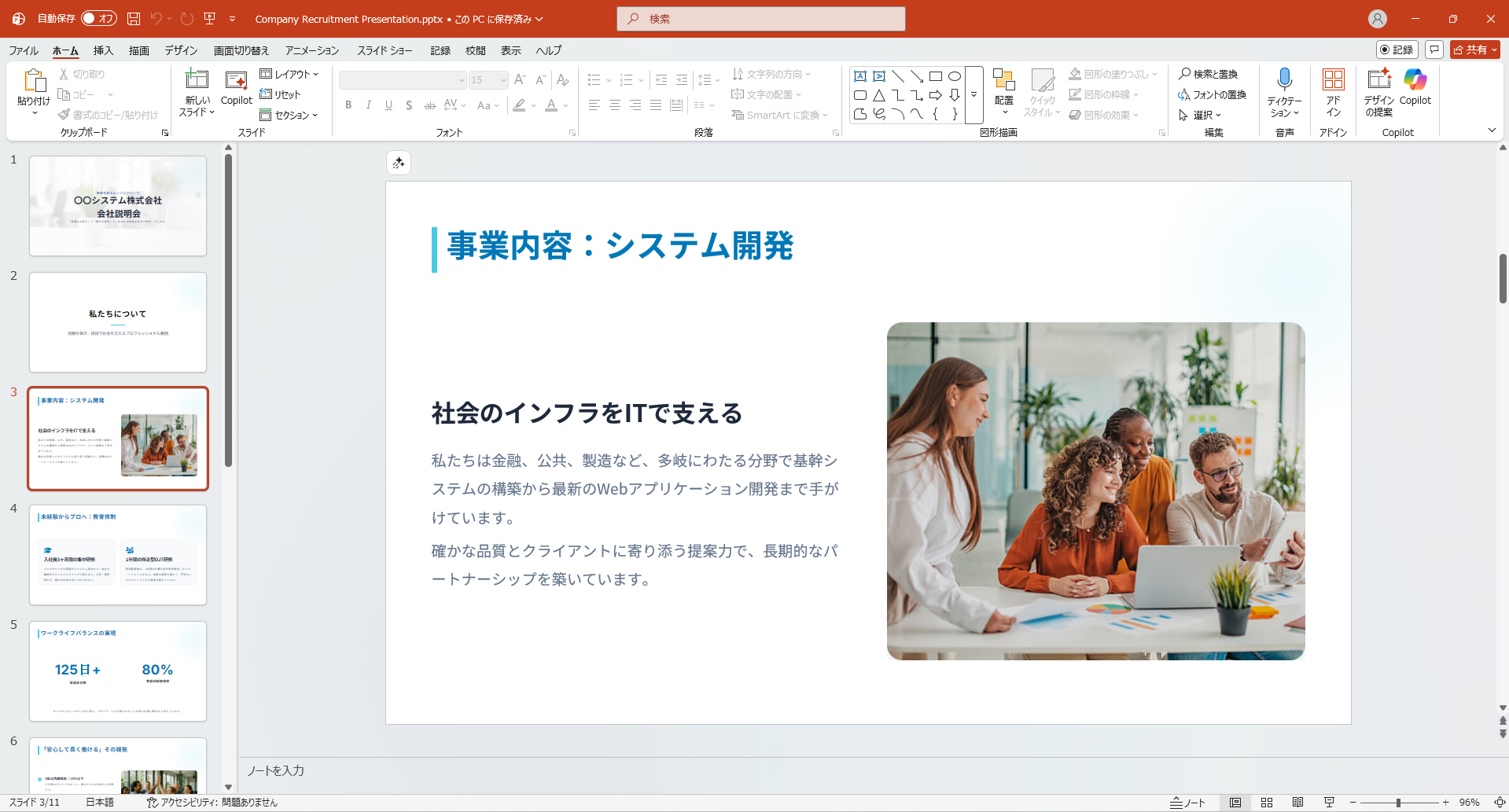就活生向けの企業説明用の資料を作成したい。全10枚のスライドで構成し、風通しの良い清潔感のある企業をイメージして作成してください。