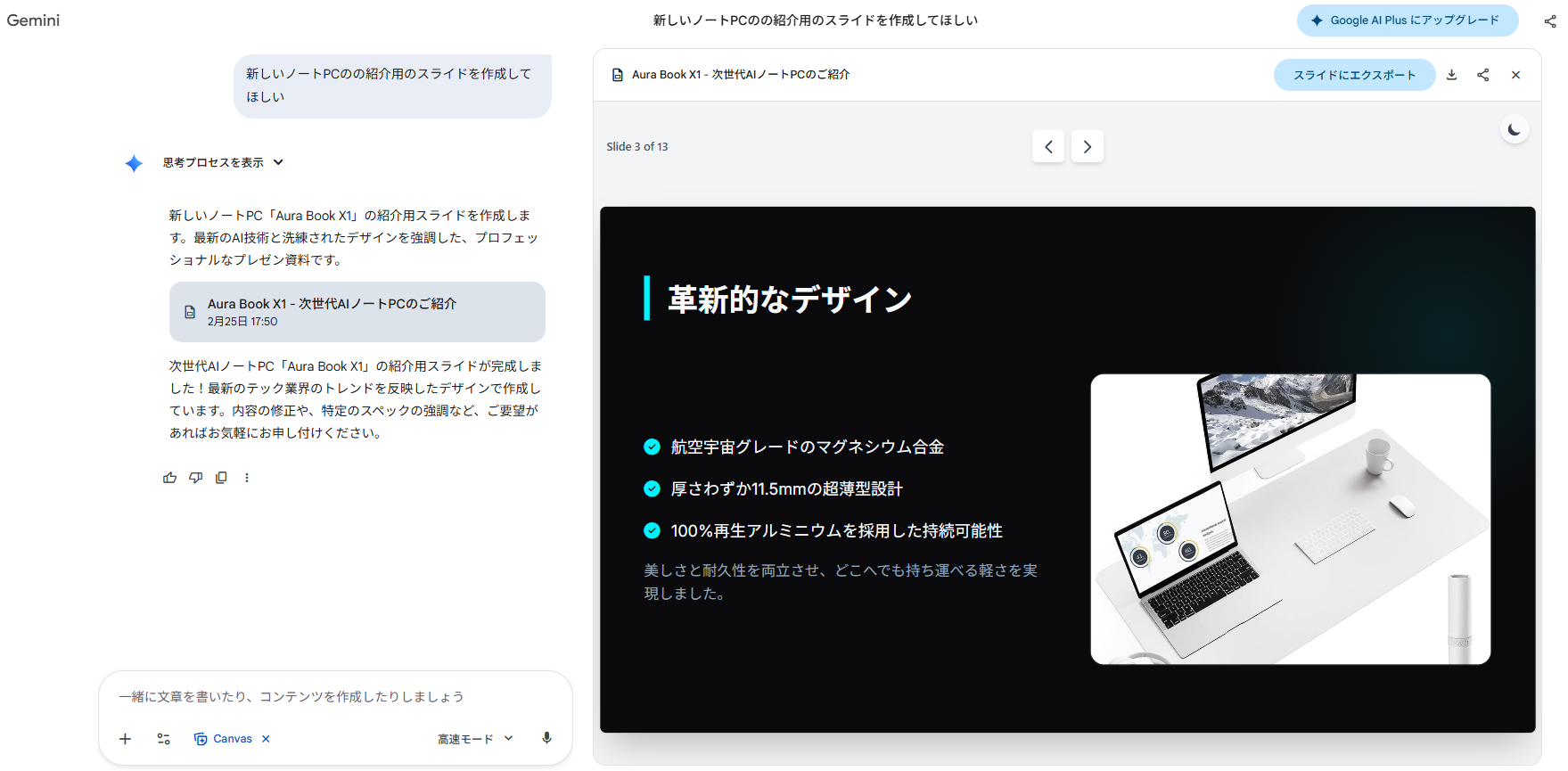 Googleの生成AI「Gemini」に搭載された「Canvas機能」を活用すれば、こうしたスライド作成の初動をスムーズに進められます。