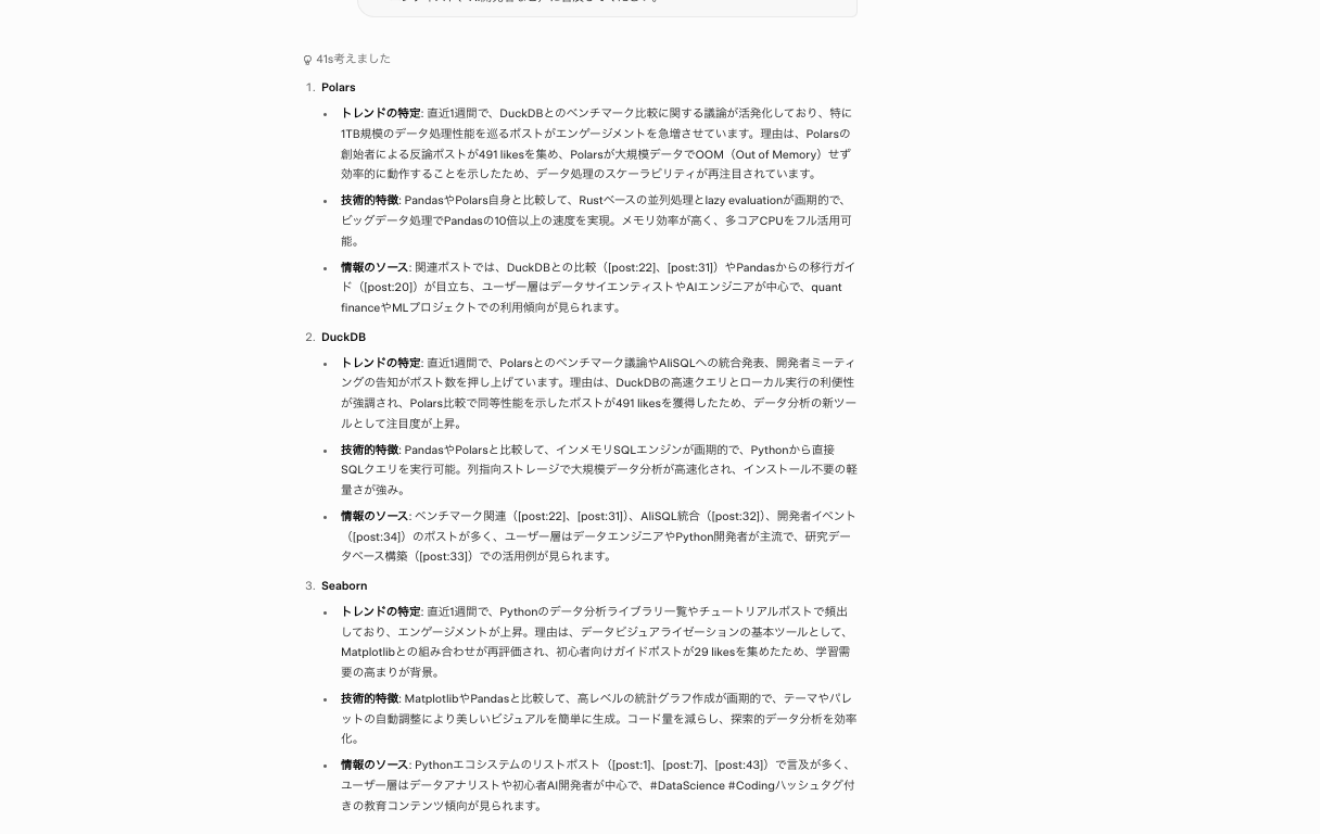 - 情報のソース: 関連するポストの内容や、話題にしているユーザー層の傾向(データサイエンティスト、AI開発者など)に言及してください。