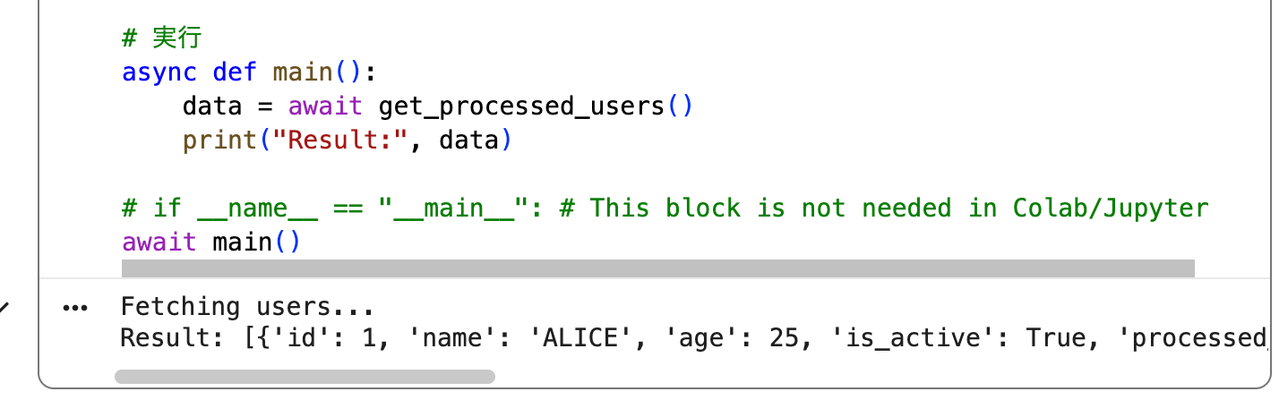 コード変換: 以下のJavaScriptコード(非同期処理とデータ加工を含む)を、Python 3.11以降のベストプラクティスに従って変換してください。