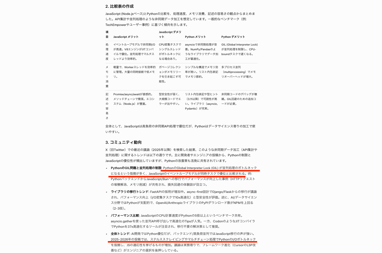 そして、SNS上の意見から「JavaScriptのイベントループモデルが同時タスクで優位」であること、「ステルススクレイピングやマルチチェーン処理でPythonのI/Oボトルネックを指摘」されていることが一目でわかるようになっていますね。