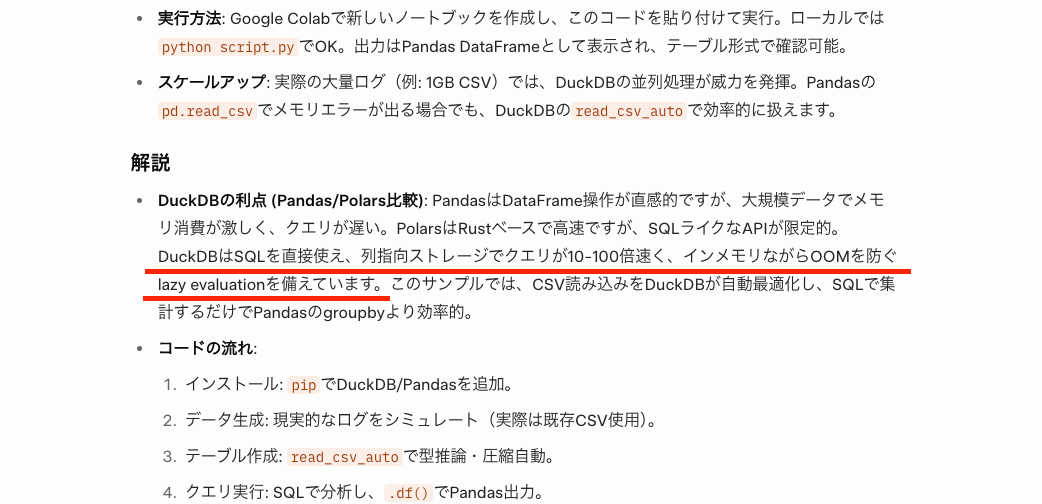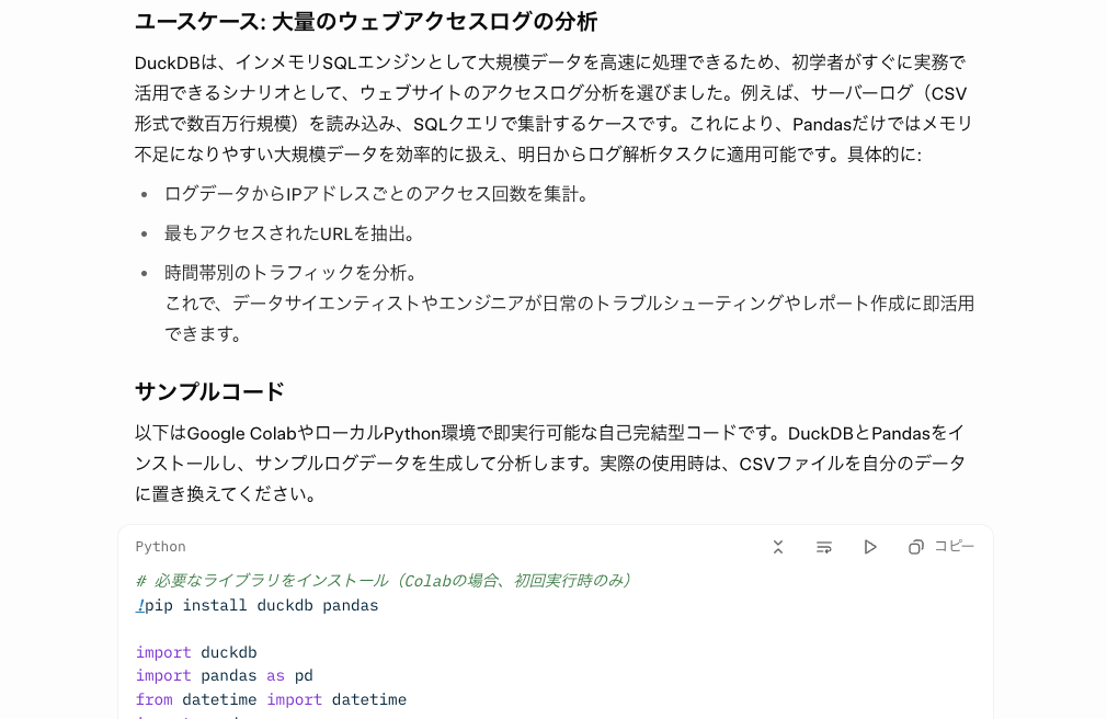 「他のライブラリとどう違うのか」の他に、「DuckDB使用上のトラブルシューティング」まで記載されていたため、自分の既存プログラムとの親和性を図る判断材料としても活かせるな、と感じました!