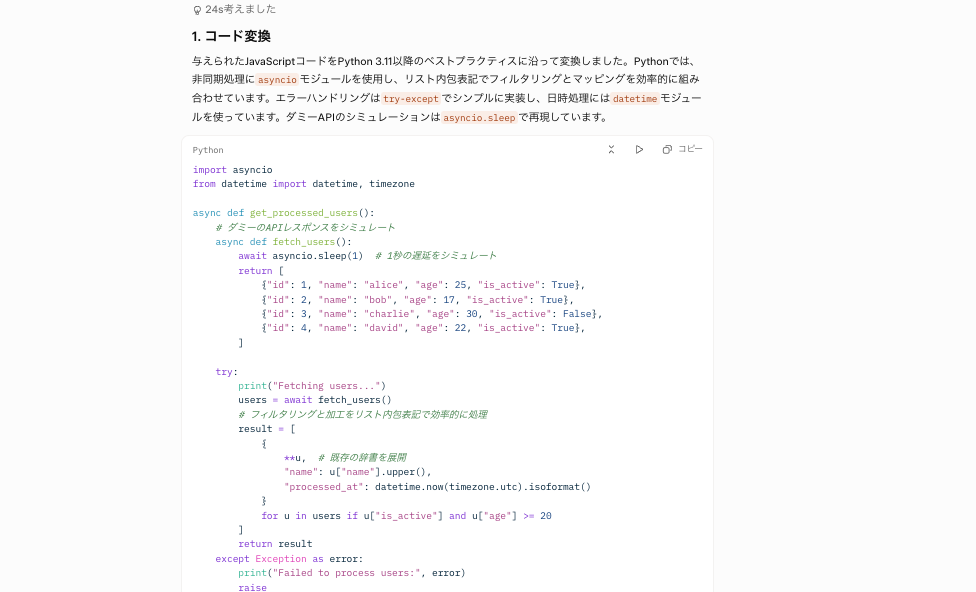 実務に応用することを想定した場合、実装コードの解説やコード変換など、時間がかかりがちな作業の一部が数分で完結するのは大きなメリットであると感じました。